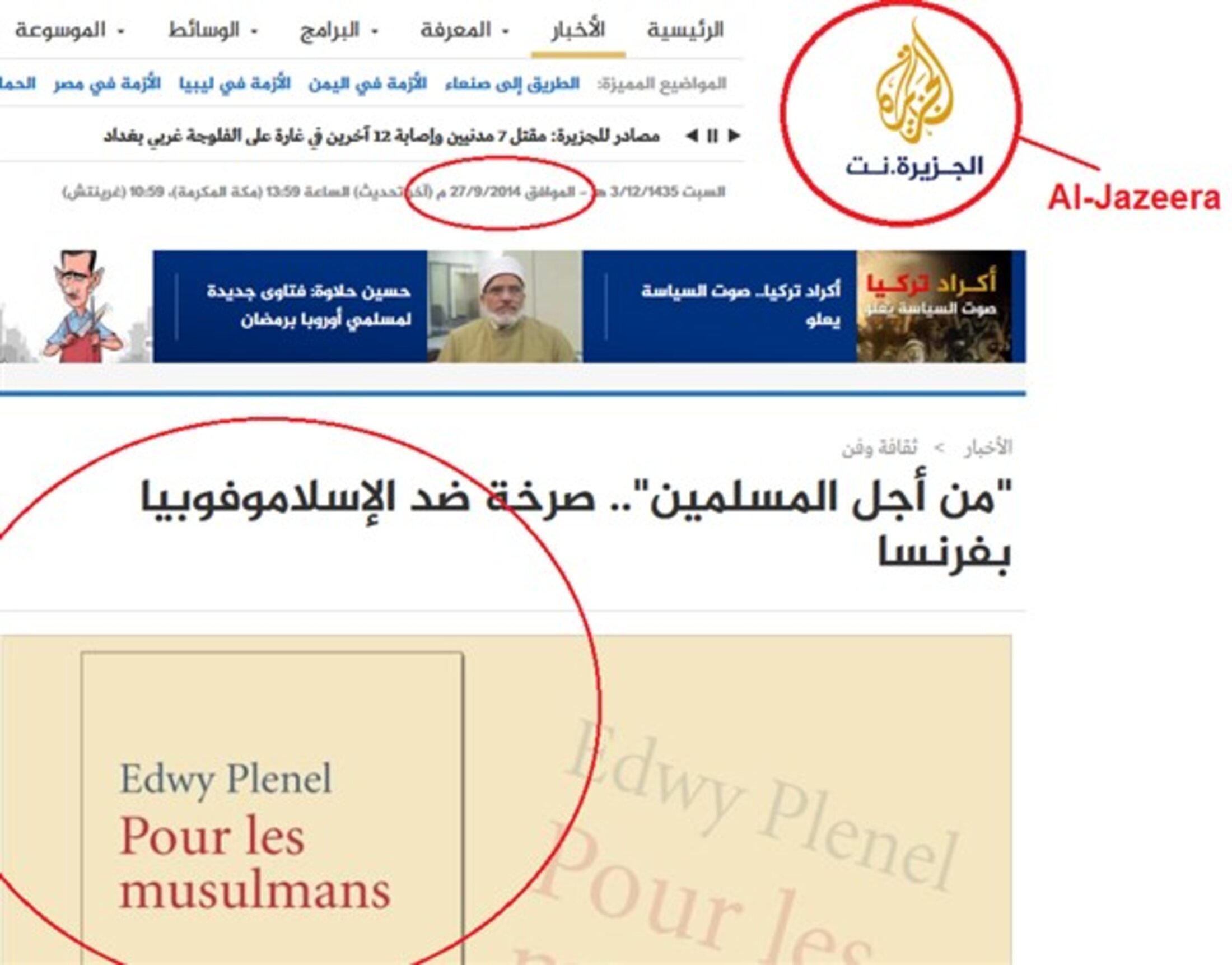Pourquoi le faire donc, lorsque l’on sait déjà qu’en plus de la diffusion gratuite par cette revue gouvernementale du plaidoyer « Pour les musulmans », la chaîne qatarie Al-Jazzera lui avait déjà consacré, le 24 septembre 2014 - moins d’une semaine seulement après sa parution ici en France - un article sur son site Internet www.aljazeera.net (ici) ?