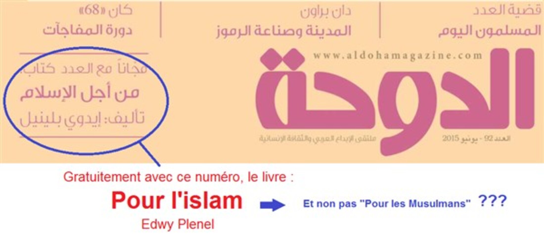 Huit mois plus tard, j'apprends que le plaidoyer d'Edwy Plenel a été traduit en arabe. Dans un premier temps, j'ai trouvé cela intéressant et même indispensable. D'autant plus que l'Occident est essentialisé et décrit par la machine islamiste comme un monstre haineux et que "les musulmans" - parce qu'ils sont musulmans - essentialisés à leur tour, en seraient les victimes ! Mais lorsque j'ai vu que c'est le Qatar qui diffuse et, en plus, "gratuitement", ce n'était plus l'arabisation du livre qui m'intéressait mais plutôt le pourquoi de cette diffusion par le ... Qatar ? Pourquoi le Qatar ?