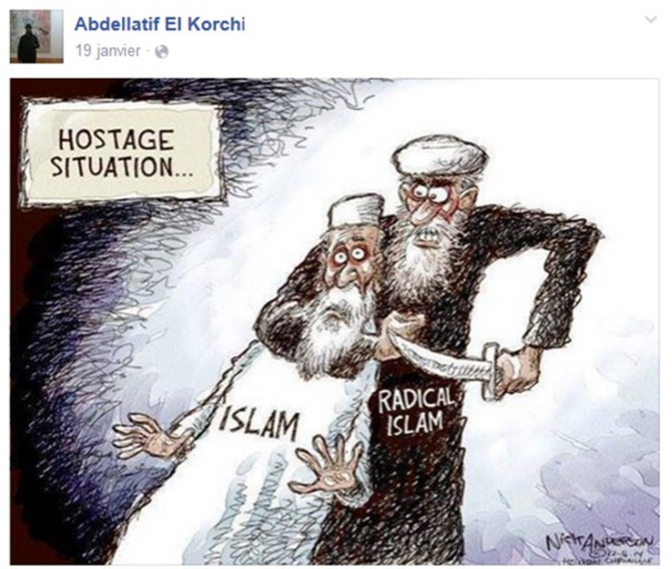 D’ailleurs, après les attentats de Paris, le traducteur publia sur sa page Facebook, le 19 janvier, une caricature montrant un « islam radical » prenant en otage, au moyen d’un sabre, un autre «islam » (voir ci-après). Je ne sais pas si, à ce moment précis, lui-même était « islamophobe » ? Car ce qu’il ne semble pas comprendre désormais, c’est justement cette différenciation nécessaire que Mediapart refuse, obstinément, de faire et de voir entre un islam humaniste pacifié, et un autre islam radical, dans toutes ses représentations extrémistes, politiques et jihadistes. Au lieu d’assumer un humanisme indépendant et affranchi, la rédaction de Mediapart préfère le déni - l’islamisme n’existe pas, écrivait Pierre Puchot - et de fréquenter des « preneurs d’otages », jugés fréquentables, ceux-là même qui revendiquent, ouvertement, la lettre et l’esprit d’un certain héritage islamiste, sous la bannière d’un Coran, pris en otage à son tour, par deux sabres !