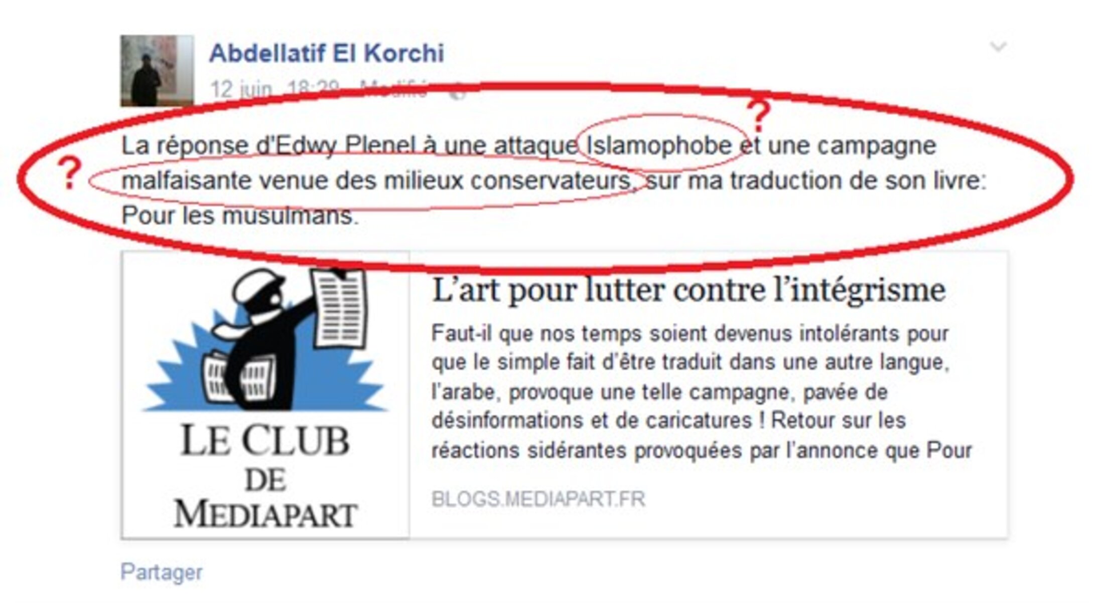 Abdellatif El Korchi, le traducteur du livre « Pour les musulmans », vient de publier un billet de « soutien » à Edwy Plenel, contre ce qu’il considère comme étant une « attaque islamophobe » et une « compagne malfaisante venue des milieux conservateurs » ! C’est bien en ces termes là qu’il présenta, « sans précaution et sans nuance », en introduction le billet du directeur de Mediapart : « L’art pour lutter contre l’intégrisme », sur sa page Facebook, le 12 juin 2015 (voir l’image ci-après).