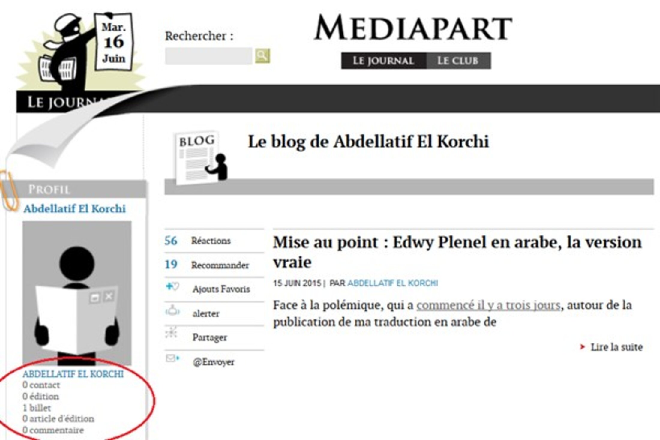 Ce Monsieur vient, visiblement, de s’abonner à Mediapart. Les données statistiques de son blog, relevées ce matin à 8h30, sont édifiantes : 0 contact (Même pas Edwy), 0 éditions, 0 articles d’édition, 0 commentaire. Cependant, et avec un tel score, la rédaction de Mediapart a jugé bon de mettre en valeur, en « une », son billet (voir ci-après) et de continuer d’ignorer délibérément, pour ne pas dire de « censurer », tous mes billets, sachant que je fais parti des abonnés fidèles à Mediapart depuis 2007/2008, et que mes « billets », surtout les deux derniers, devaient, à mon sens, dans le respect d’une certaine déontologie, être traités égalitairement. L’on ne doit pas - disait mon maître - censurer la question et publier la prétendue réponse. Mediapart préfère-t-elle, à ce point là, la parole qui flatte l’égo à celle qui interroge le sens ?