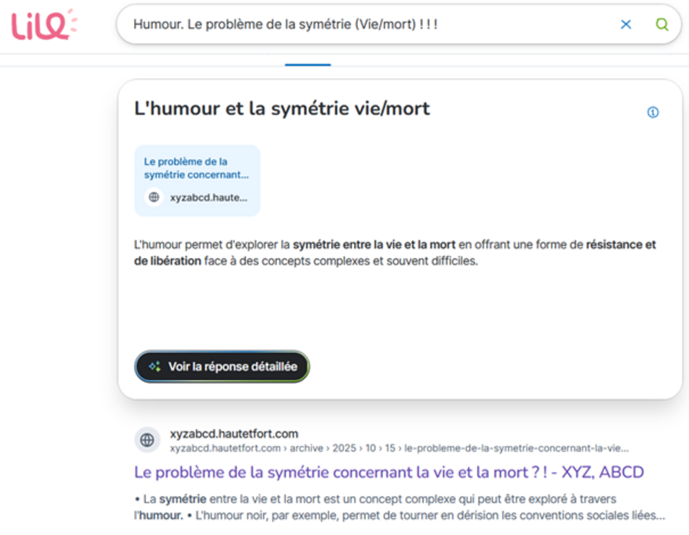 Mais son double, « Le problème de la symétrie concernant la vie et la mort ? ! – XYZ.ABCD », parce que, par prudence, pour ne pas être pris au dépourvu, je publie, en changeant les titres, les mêmes articles sur le blog Hautefort !
