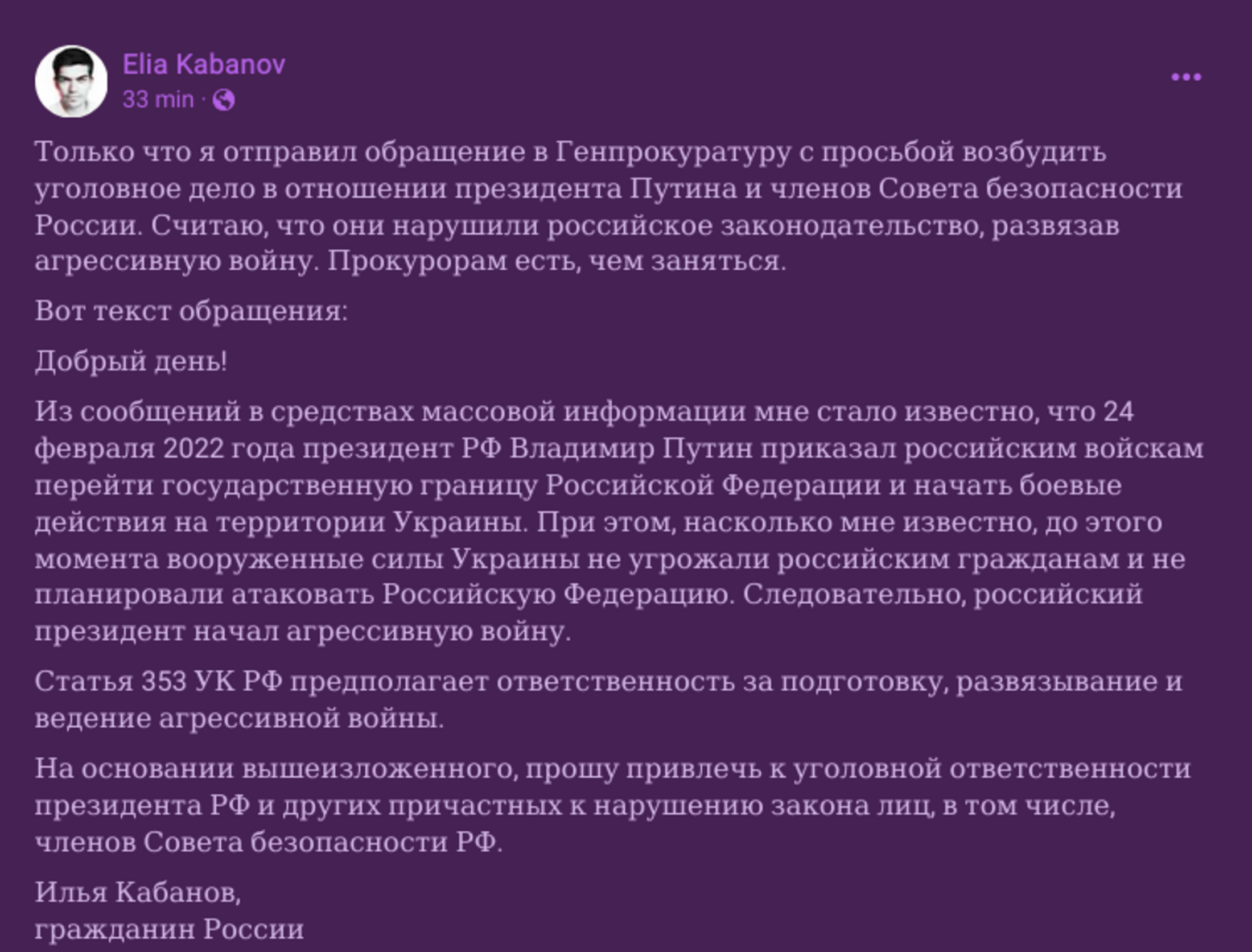 Je viens d’adresser un appel au bureau du procureur général avec une demande d’ouverture d’une procédure pénale contre le président Poutine et les membres du Conseil de sécurité russe. Je crois qu’ils ont violé la loi russe en déclenchant une guerre d’agression. Les procureurs ont fort à faire.