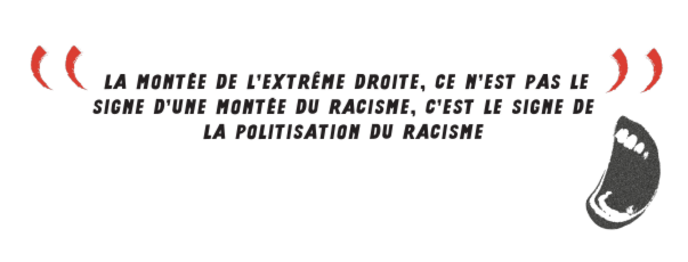 EM : Tu critiques également le côté épouvantail que peut avoir le RN, avec un appel dans la conclusion à prendre en charge collectivement cette question du racisme qui n'est pas confinée qu'à ce seul parti. Il y a tout un ordre racial, politique, médiatique et économique qui permet au RN d'exister en tant que tel.