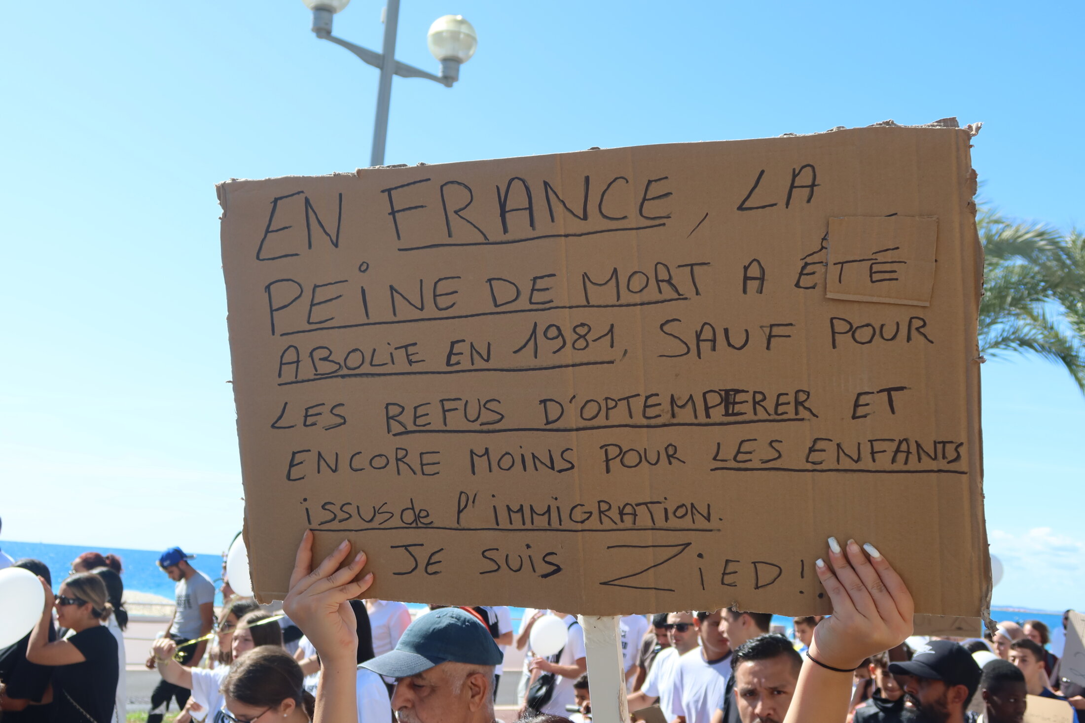 Environ 200 personnes sont présentes ce dimanche matin, à 11 heures, devant l’immeuble où résidait Zied, boulevard de la Madeleine. De ce quartier populaire de Nice, s’élance silencieusement la foule, vêtue de T-shirts blancs avec inscrit en lettre noires « Justice pour Zied, un ange parti trop tôt », direction le Palais de justice. Dans le cortège, ses voisins, ses amis, sa famille, mais aussi quelques figures politiques locales de gauche. Colère froide et tristesse contenue se dégagent des rangs. On discute ça et là des mensonges proférés à l’encontre de Zied, de la non-nécessité du tir, et de l’indécence après sa mort. Il a été dit que Zied était arrivé en France il y a un an. Premier mensonge. Zied a grandi à la Madeleine, comme nous l’explique l’une de ses amies d’enfance à la pancarte exhaustive : « En France, la peine de mort a été abolie en 1981. Sauf pour les refus d’obtempérer et encore moins pour les enfants issus de l’immigration ».
