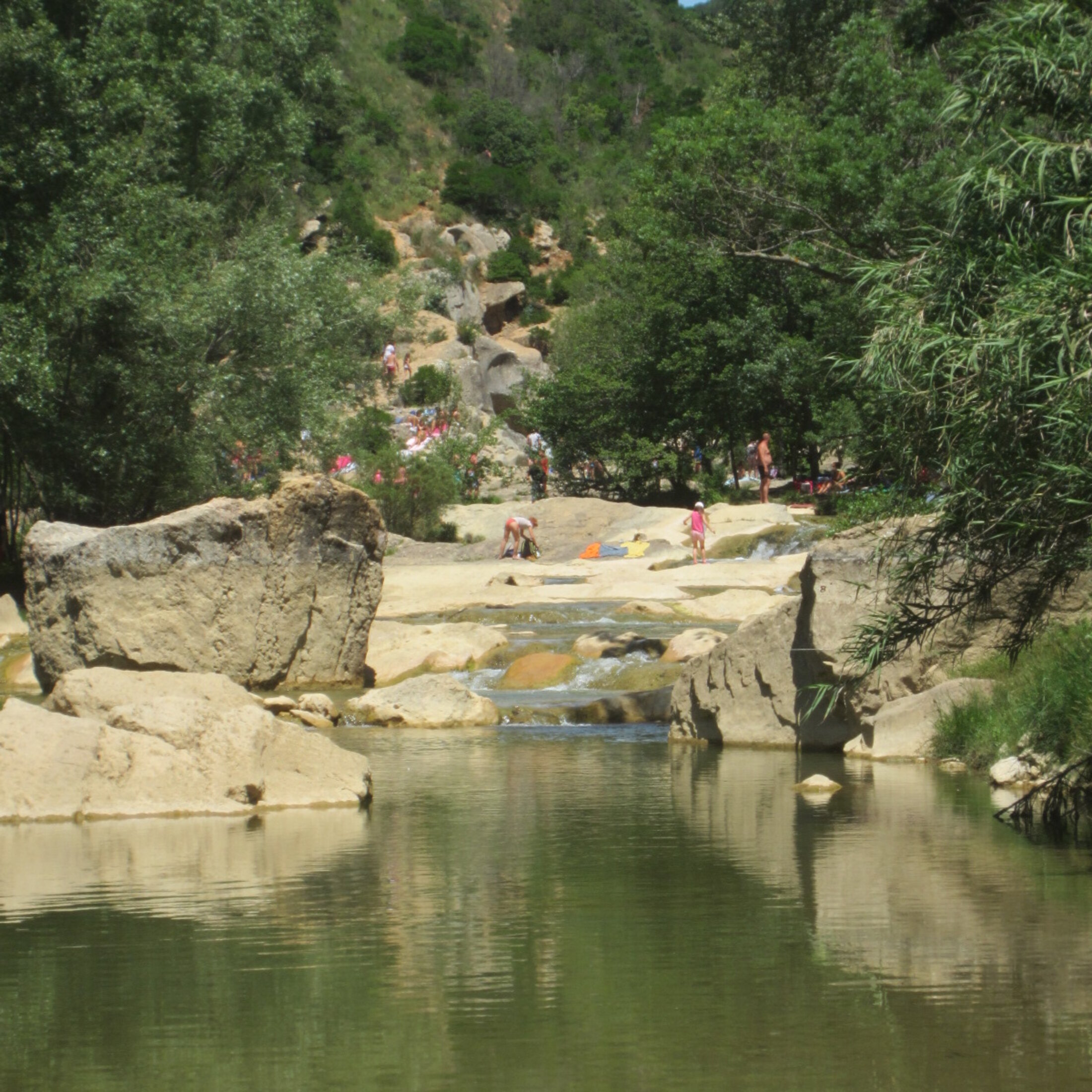 Max se gare sur un parking. Devant une rivière coulant entre terre et rochers. Le son des cascades se mêle aux voix. Il y a déjà affluence de pique-niqueurs sur le site. Avec nombre de gosses en grappes sur les rochers en étages.Tout le monde cherche de l’ombre. Une denrée rare sous le soleil de plomb de midi. Certains, comme nous deux, tentent d’ éviter la promiscuité. Difficile d'y échapper. Nous réussissons à trouver une place pas trop peuplée, près de la rivière. Je dépose le panier sur l'herbe. « Merde ! J’ai oublié les couverts.». Max retourne à la voiture. J’en profite pour aller tremper les pieds dans la rivière. L’eau est très fraîche. Je m'installe sur un rocher.