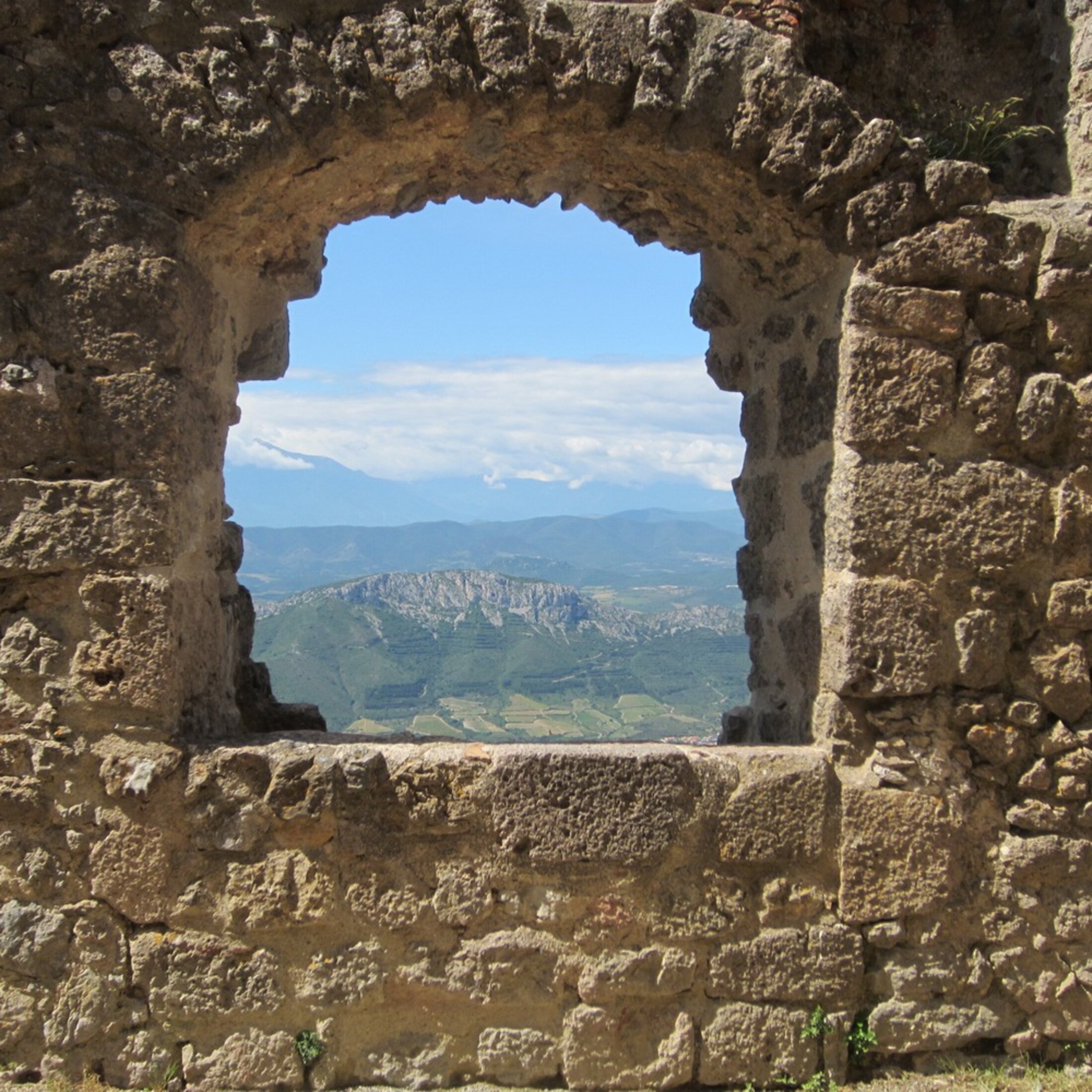 Le château se trouve sur un piton rocheux à plus de 500 mètres de haut. Vu de la route, il forme une masse sans forme. Comme une excroissance de la falaise. Plus on se rapproche sur le chemin escarpé, plus les lignes du château se dévoilent. Chaque partie érodée ou disparue laisse deviner la bâtisse au moment où elle était habitée. Ainsi que le labeur pour la construire. Je m’approche de la vaste ouverture carrée. Une sorte d’écran géant entre deux murs. Max, qui a le vertige, reste derrière moi. Je le sens fort inquiet à chacun de mes déplacements. Il est très pressé de retrouver le plancher des vaches. La guérite de l’accueil et les voitures du parking sont minuscules. Je descends un escalier en colimaçon. Il conduit à une pièce plongée dans la pénombre. Max allume la lampe de son portable. On entend des pas. Un homme se met à chanter dans une des salles voûtées. « Arrête tes conneries papa ! ». Nous remontons. Pour attaquer la visite de la partie nord du château.