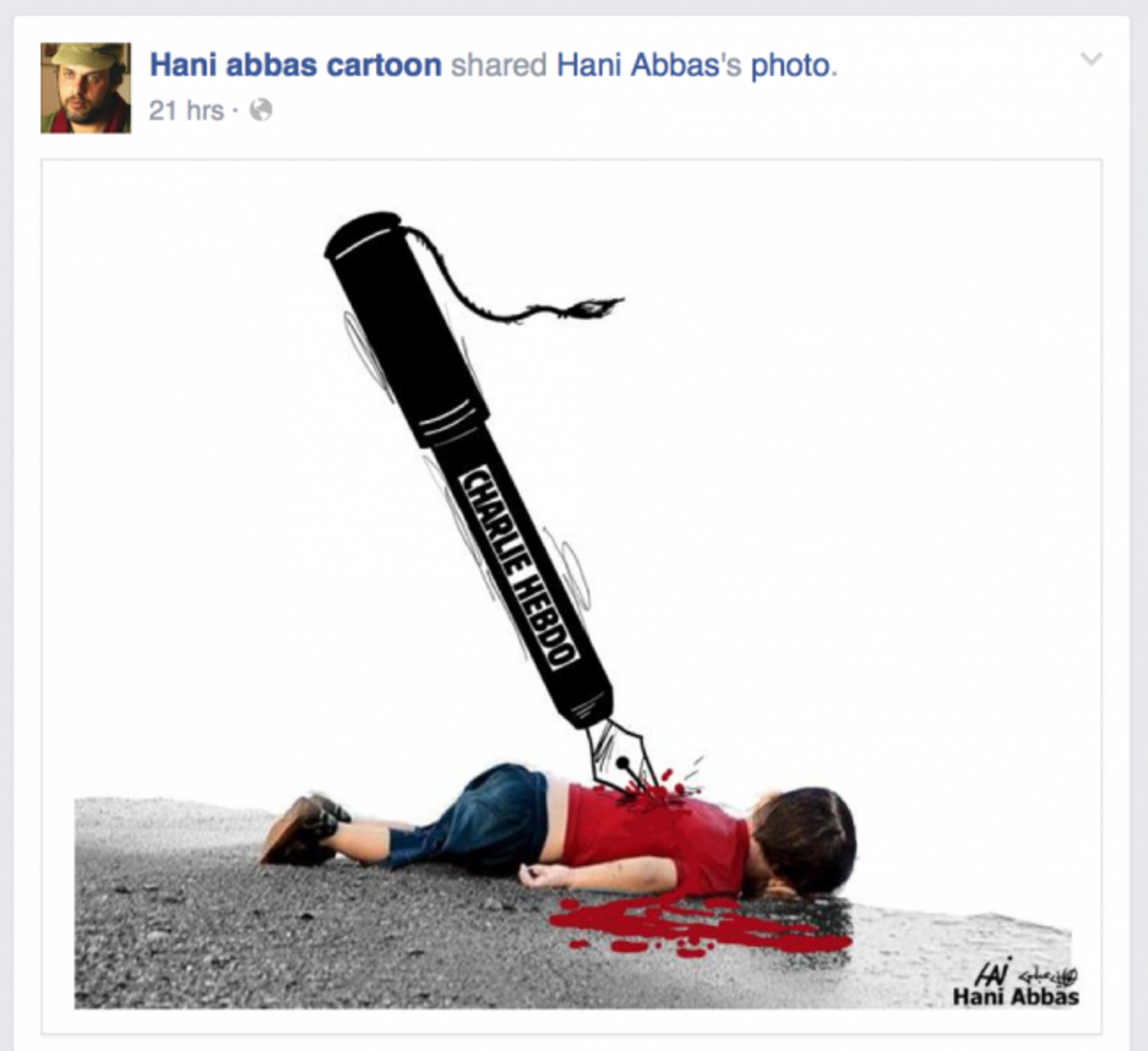 Comme avec la réplique cinglante de Hani Abbas: Aylan transpercé d’une plume Charlie Hebdo. Un dessin très provoquant aussi. Image violente contre image violente. La reine de Jordanie réagissant sur un registre plus consensuel. Une réaction qui me semble moins déclencheuse de réflexions. Contrairement à ces deux caricaturistes, aux angles différents, nous obligeant à sortir de notre douillette couette mentale. Réfléchir hors de nos pensées battues. Quoi qu'il en soit; la plus réussie des caricatures, le plus beau discours, ce petit billet d’humeur, etc, ne ressuscitera pas ce gosse. Ni tous les réfugiés. Sans oublier les autres victimes continuant de crever sur la planète, hors regard numérique. Les martyrs visibles et invisibles de notre époque ?