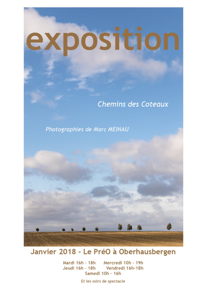 Une exposition de photographies sur les chemins des coteaux, lieu connu sous le nom de colline de Hausbergen, à l'ouest de Strasbourg. Visite libre aux heures d'ouverture du Préo, à Oberhausbergen et les soirs de spectacle. Mardi, jeudi et vendredi de 16h à 18h, mercredi de 10h à 19h et samedi de 10h à 16h durant tout le mois de janvier 2018.