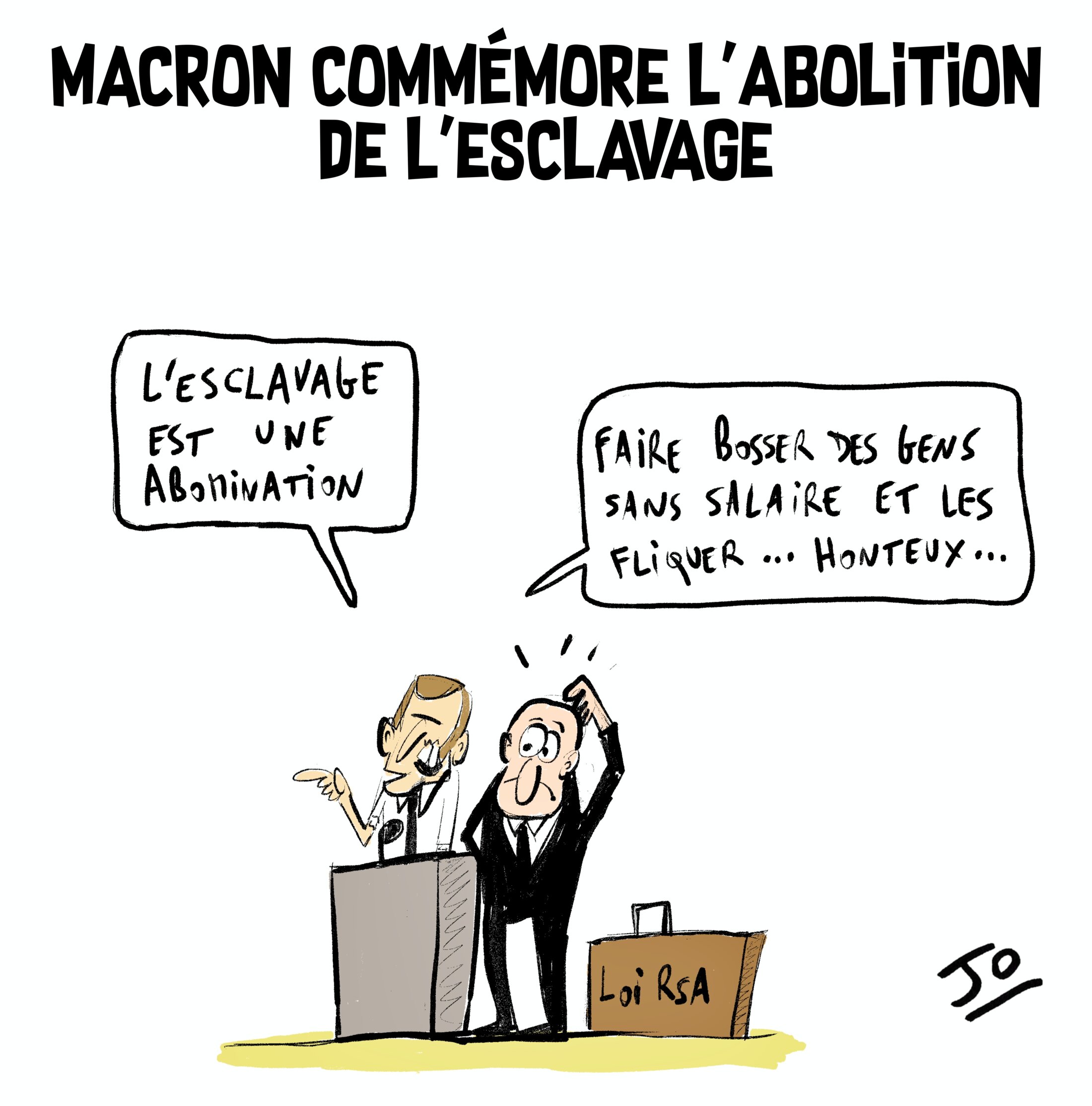 Cette semaine, not’ souverain poncif (bah oui, il sort que des poncifs) a choisi le bon timing: faire le ménage en outre mer et ressortir les bonnes vieilles politiques d’outre merde… Avec sa loi d’immigration, déjà abolie avant même d’être proposée à l’Assemblée.. Ça ne prend plus trop, cette fois, va falloir trouver plus consistant, fichtre! Alors, à l'occasion de l'anniversaire de l'abolition de l'esclavage il rendit hommage à Toussaint Louverture, grand artisan de l’abolition en terres ultra-marines. Le hasard du calendrier a voulu que l'hommage ait lieu la même semaine que la décision de rendre le RSA conditionnel à des heures de travail obligatoires et non rémunérées. Travailler gratuitement (pour “se former à un métier”). Ce que Toussaint Louverture aurait nommé… de l’esclavage. Honorer l’abolition de l’esclavage dans un pays ultra-libéral, où les travailleurs indépendants n’ont aucun statut, où les petits emplois précaires pullulent (3 millions de travailleurs minimum), et où les RSIStes vont devoir bosser gratis (bénévolat salarié, c’est beau comme du Orwell)… Ça ne manque pas de sel. Manu qui rend hommage à un abolitionniste, c’est comme Gérard Larcher qui rendrait hommage aux diététiciens, Poutine à Mandela, ou Marlène Schiappa aux philosophes des Lumières. Et pourtant, c’est ce qu’il fit cette semaine, le bougre. Et il a même osé profaner sa tombe: “Toussaint Louverture avait compris que la seule insoumission était vaine" (vous comprendrez la référence, subtil tacle aux seuls opposants qu'il se soit trouvé à l'Assemblée…)... "C’est pourquoi, poursuit-il, contre les autres chefs de la révolte des esclaves, il prit le parti de la révolution, plutôt que l’insurrection, la liberté plutôt que la destruction, l’ordre au-dessus du chaos”. C’est une tendance, l'imposture historique, mais là on est dans un véritable cas pathologique, schizophrénie politique qu’on retrouve chez le RN, parti co-créé par un membre de la Wafen SS et qui invoque tous les 2 du mois, le général de Gaulle (la seule raison pour laquelle ils existent c’est justement parce que de Gaulle n’a pas nettoyé en profondeur la France de ses anciens collabos, dans un souci… d’apaisement, oui à cette époque aussi on prônait l’apaisement)... Et bien en Macronie c’est pareil: on célèbre la révolution contre l’insurrection, on prône la liberté entre deux 49.3, et on fait l’éloge d’un esclave révolté qu'on aurait sûrement maté à coups de Tonfa avant de le rendre à ses propriétaires, avec les excuses de la maison… Macron est un esclavagiste qui se prend pour un esclave. Quand il parle aux artistes, il vient mal coiffé, quand il va voir Zelensky il se laisse pousser une barbe de deux jours avec un vieux t shirt vert dégueulasse, pour Toussaint Louverture j’mattendais à le voir débouler en black face…