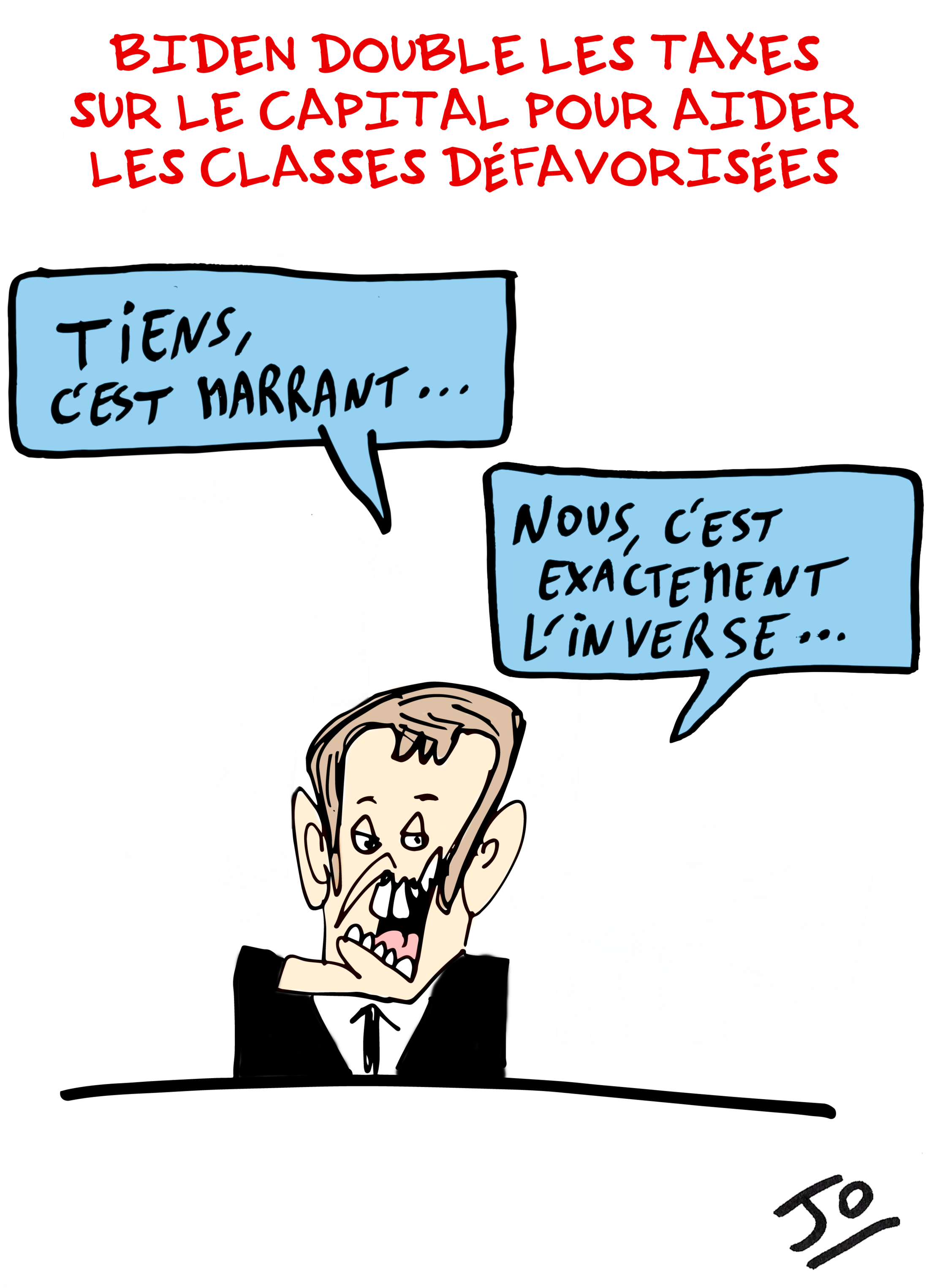 Nul n'aurait prédit que Joe Biden, un libéral un peu mou durant sa campagne présidentielle, aurait mené ces actions. Aujourd'hui, auprès du Congrès, il a égrené tout un tas de mesures interventionnistes et de lutte contre les inégalités rarement atteintes dans le pays du libéralisme. Dans son discours, il dit notamment "dans ce pays, les dirigeants d'entreprise gagnent 320 fois plus que la salarié moyen de leur société. Auparavant, cet écart était de 100". Partant du constat très clair des inégalités sociales qui ont explosé durant la crise, il montre qu'il est socialement et moralement inacceptable qu'un tel écart existe, à l'heure où des millions de citoyens sont tombés dans la précarité. Dans ce discours, ancré clairement à gauche, Joe Biden a surtout dénoncé le cynisme du libéralisme, une vérité qui a toujours été, mais qui s'est accrue en période de crise, au point d'apparaître comme "injuste" au yeux de citoyens qui jusqu'alors y voyaient un système acceptable. C'est donc un aveu réaliste et non du communisme acharné qu'il met en application. La fin du discours est d'ailleurs sans appel: "le ruissellement n'a jamais fonctionné". Une phrase qui résonne comme une sentence sans appel, impitoyable même, dans un pays "modèle" du capitalisme, et qui en a vu les limites, pour ne pas dire l'incurie, en temps de crise. Seuls quelques dirigeants aveuglés par l'idée d'un salut par la finance, tel Emmanuel Macron y croient encore. Dans les faits, des pays européens bien libéraux ont pris des décisions allant dans le même sens logique d'une justice fiscale: l'Angleterre a opté pour une taxation des plus riches pour financer la relance économique (1). Au Danemark, il en est de même, pour financer les retraites (2). Récemment, la Première ministre de Nouvelle-Zélande, que nos médias chérissent pour sa gestion exceptionnelle de la crise sanitaire, s'est fendue d'une augmentation historique des taxes à l'encontre des plus riches à hauteur de 39% (3); peu s'en sont félicité parmi nos médias. Un peu partout dans le monde, y compris au sein du FMI, qui préconise cette option de bon sens, l'idée, longtemps "taxée" de fantasme d'extrême gauche, fleurit. Mais en France, au fait?