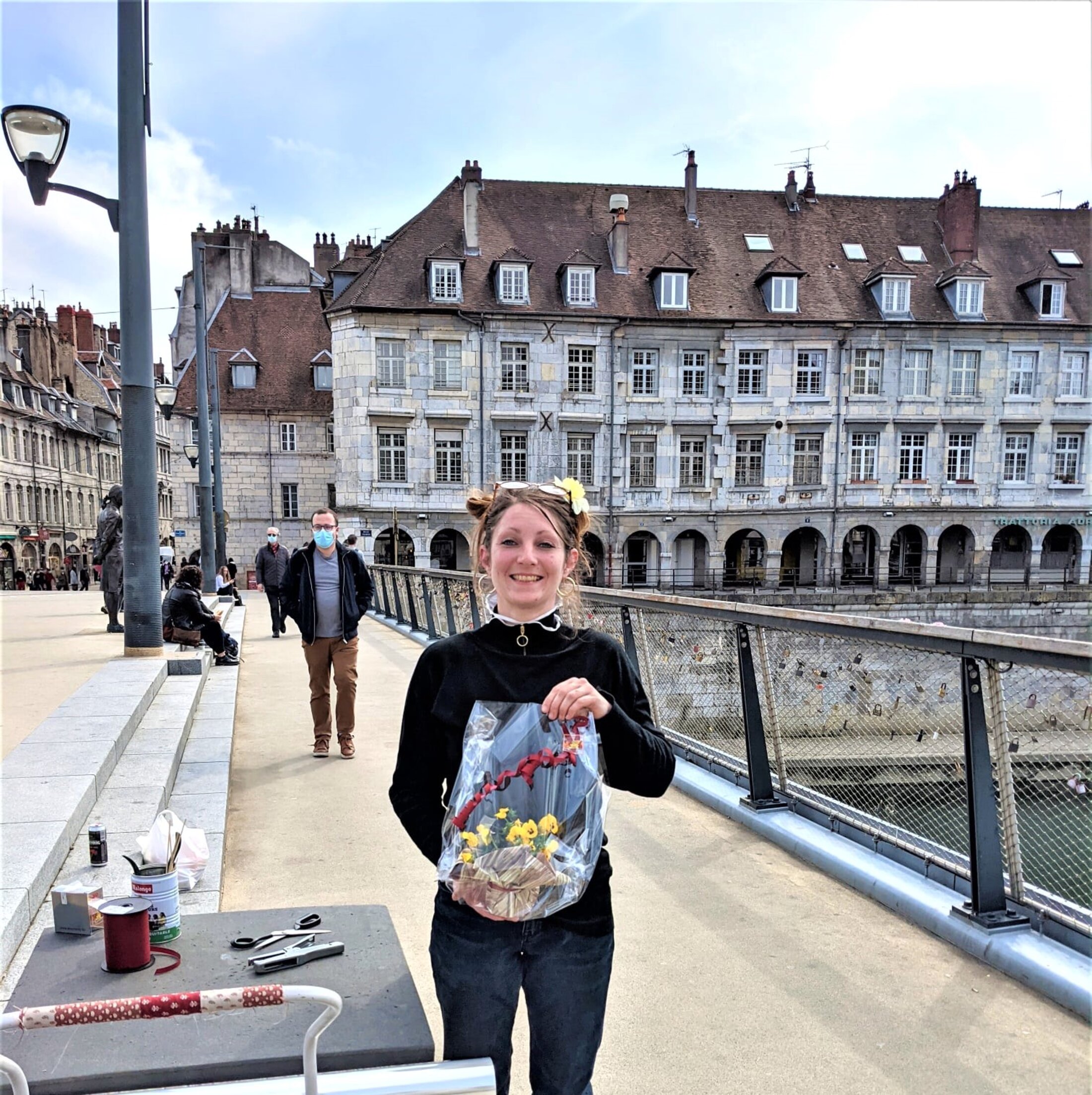 Photo : jeune fleuriste sur le pont Battant (Besançon)