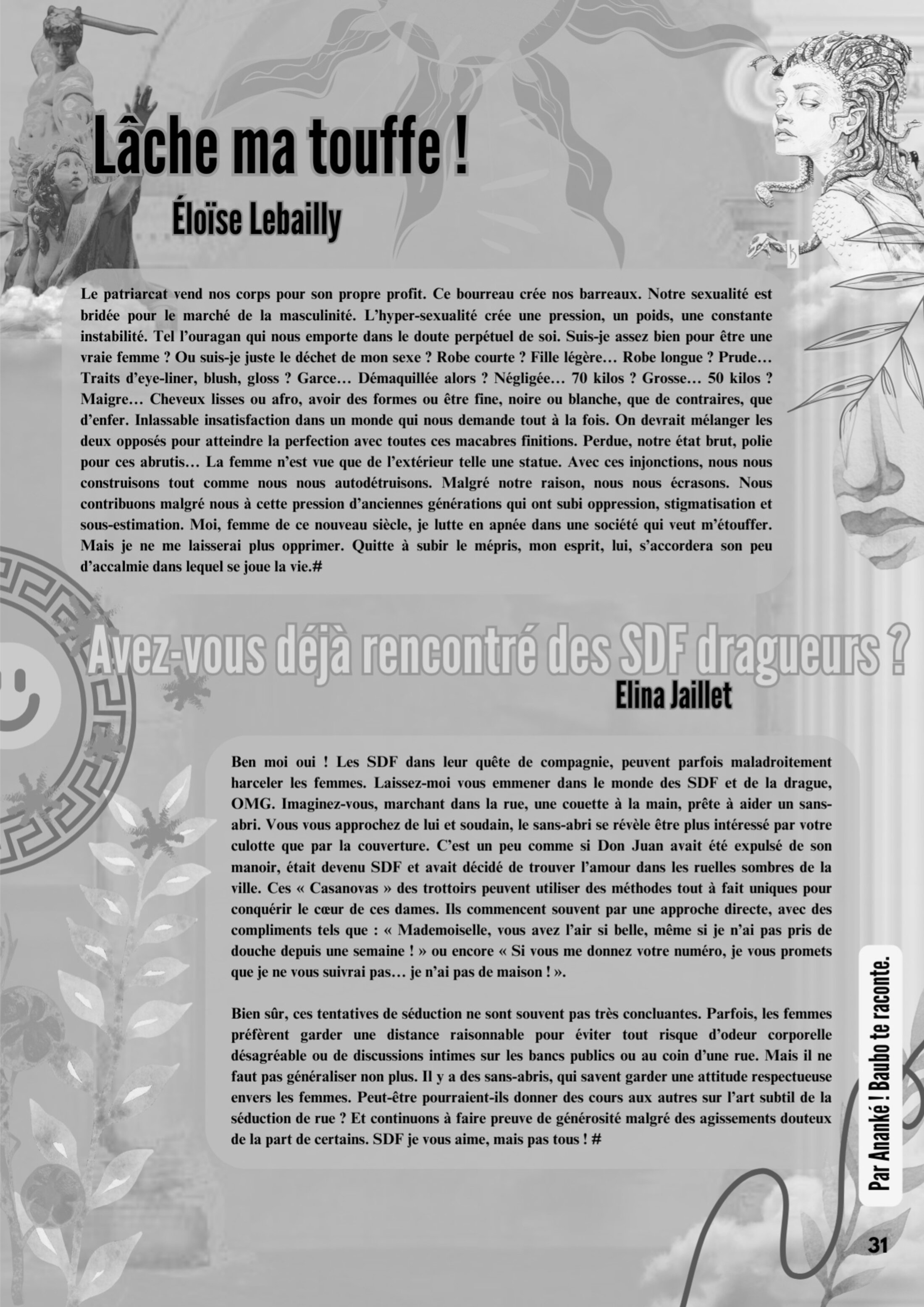 Dans le cadre des Écritures de du réel, chères à Laura Hurt, les sujets abordés vont du corps aux relations, en passant par les combats sociétaux, toujours avec humour et profondeur. Engagé et subversif, il célèbre une vision libre et vraie de la femme moderne. Le magazine offre un espace de réflexion et d’échange, tout en restant accessible et inclusif.