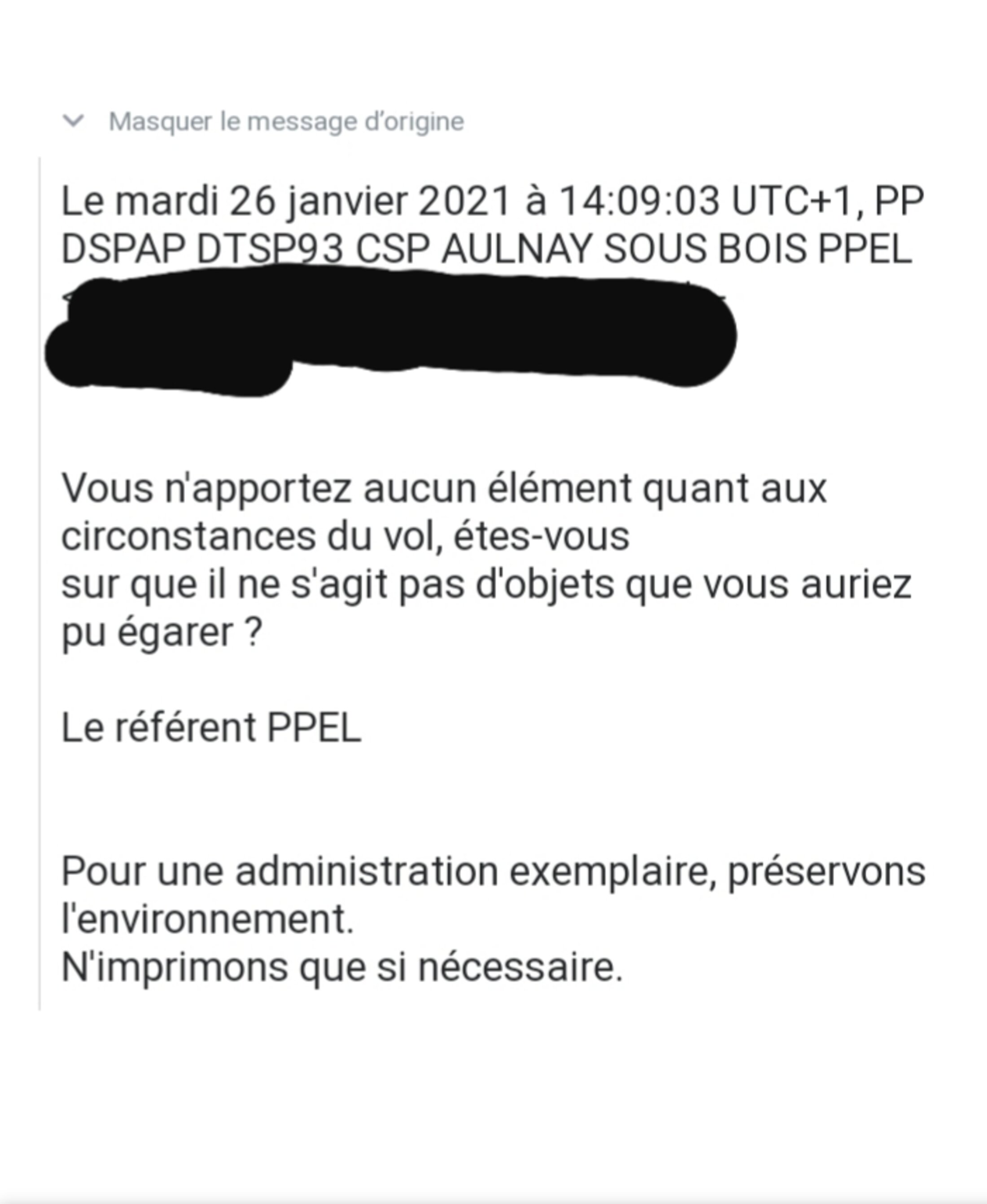 Mais le commissariat d'Aulnay sous bois s'autorise ENCORE à remettre en cause le bien-fondé de mes plaintes, en sous-entendant que les vols sont peut-être des pertes (je sais pas...je vis pas avec un flic, donc je ne sais pas d'où ca sort cette remarque) .