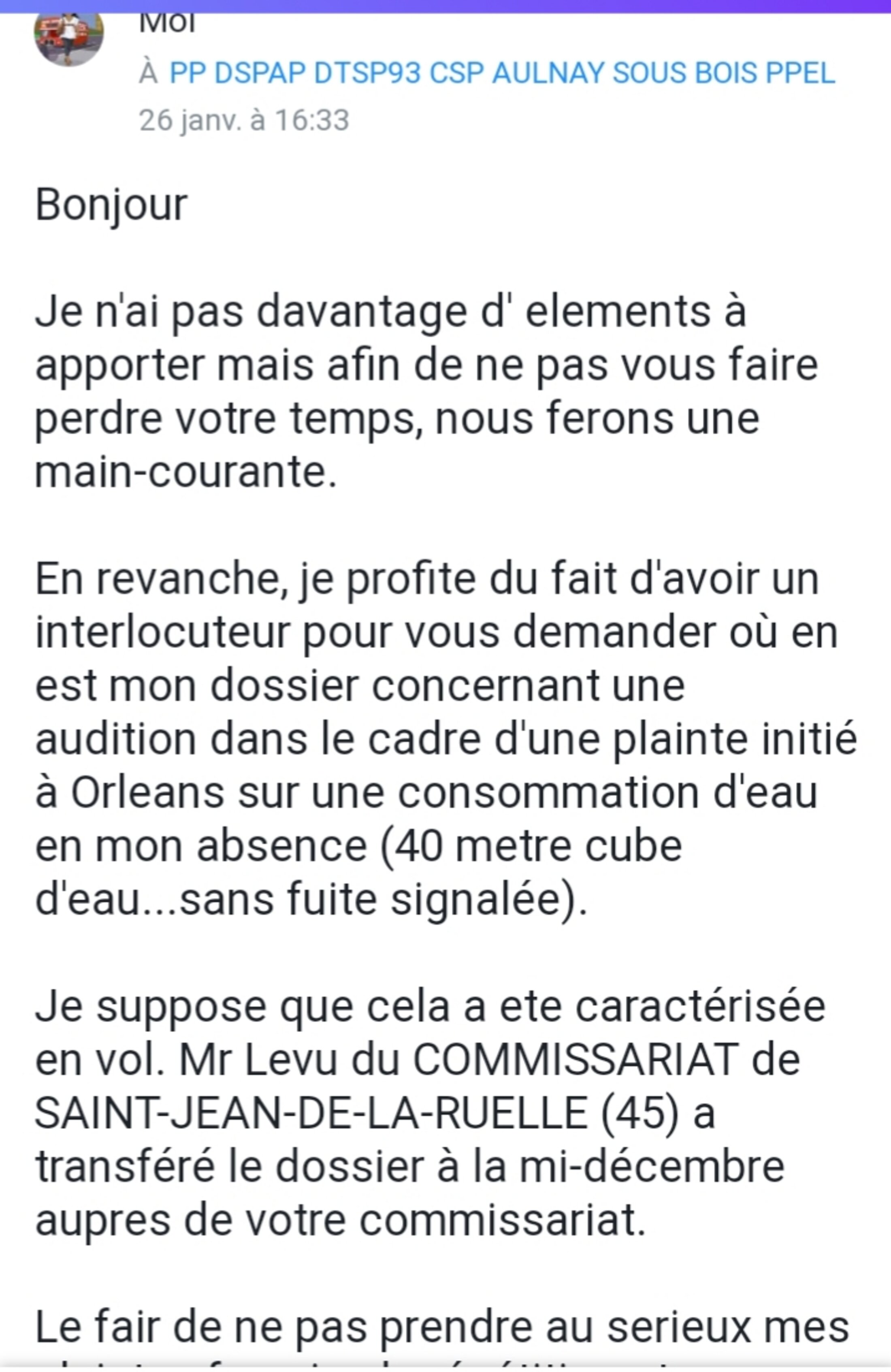 La police de Saint-Jean-De-LaRuelle m'a contacté pour prendre une plainte (déjà déposée, mais au commissariat d'Orleans sur une consommation de 40 metre cube d'eau en mon absence, et en l'absence de toute fuite...Donc un vol impliquant probablement une intrusion a domicile. J' avais fait intervenir un expert via mon assurance. Toutes les preuves sont là donc même un stagiaire en première année de droit auprès d'un procureur SAURAIT que c'est une plainte inclassable.)