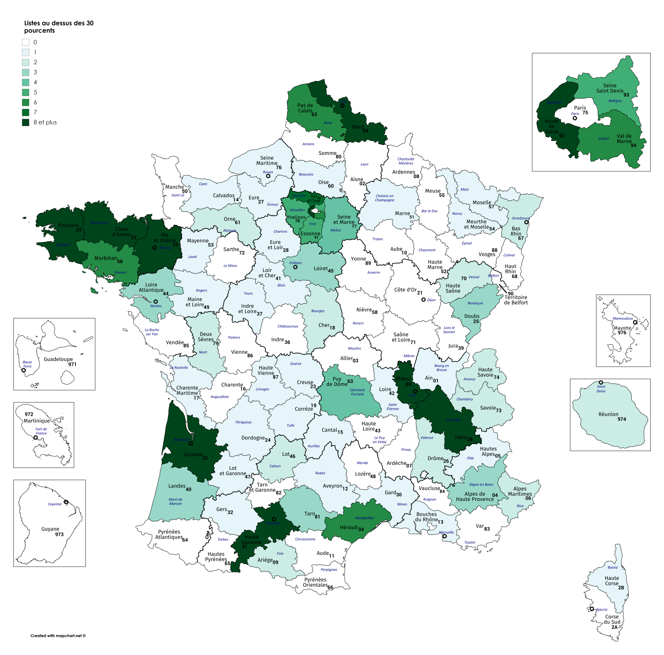 Nous allons finir notre analyse des performances écologistes aux élections municipales par une troisième donnée : les listes écologistes (ou soutenues par les écologistes) ayant dépassé les 30 pourcents. Là encore les communes de moins de 2500 habitant-e-s sont exclues du jeu de données, puisque ces communes (encore plus que les autres) ont des élections municipales très peu partisanes*.