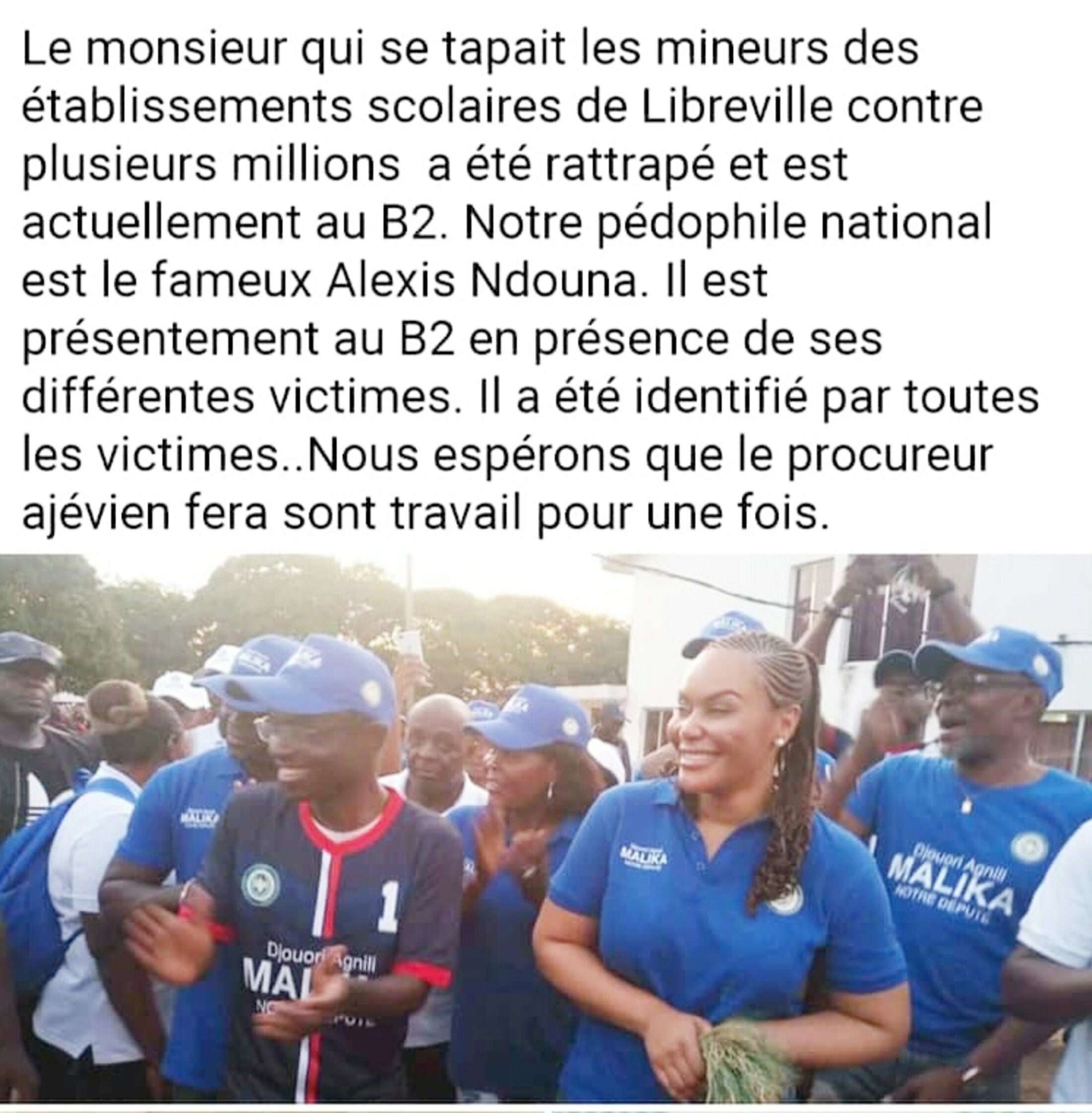 A la périphérie de cette affaire, une autre a subitement éclaté. C’est celle dite « Alexis Ndouna », et qui présente les mêmes caractéristiques. Les 25 et 26 mai derniers, les internautes gabonais ont été alertés par plusieurs messages plus alarmistes les uns que les autres. Florilège : « Alexis Ndouna trempé dans une affaire de mœurs appelée dans leur jargon la livraison…Tout Libreville en parle, leurs cibles les métisses et les filles vierges… . « Nous venons de vivre un événement digne d’un film hollywoodien il y a quelques jours. Alexis Ndouna, impliqué à 100% dans l’affaire du réseau des jeunes filles placées en prostitution dans les lycées a été arrêté par les éléments de la PJ…(…) Après l’opération de la PJ, le procureur de la République a reçu des ordres pour faire capoter l’enquête ».
