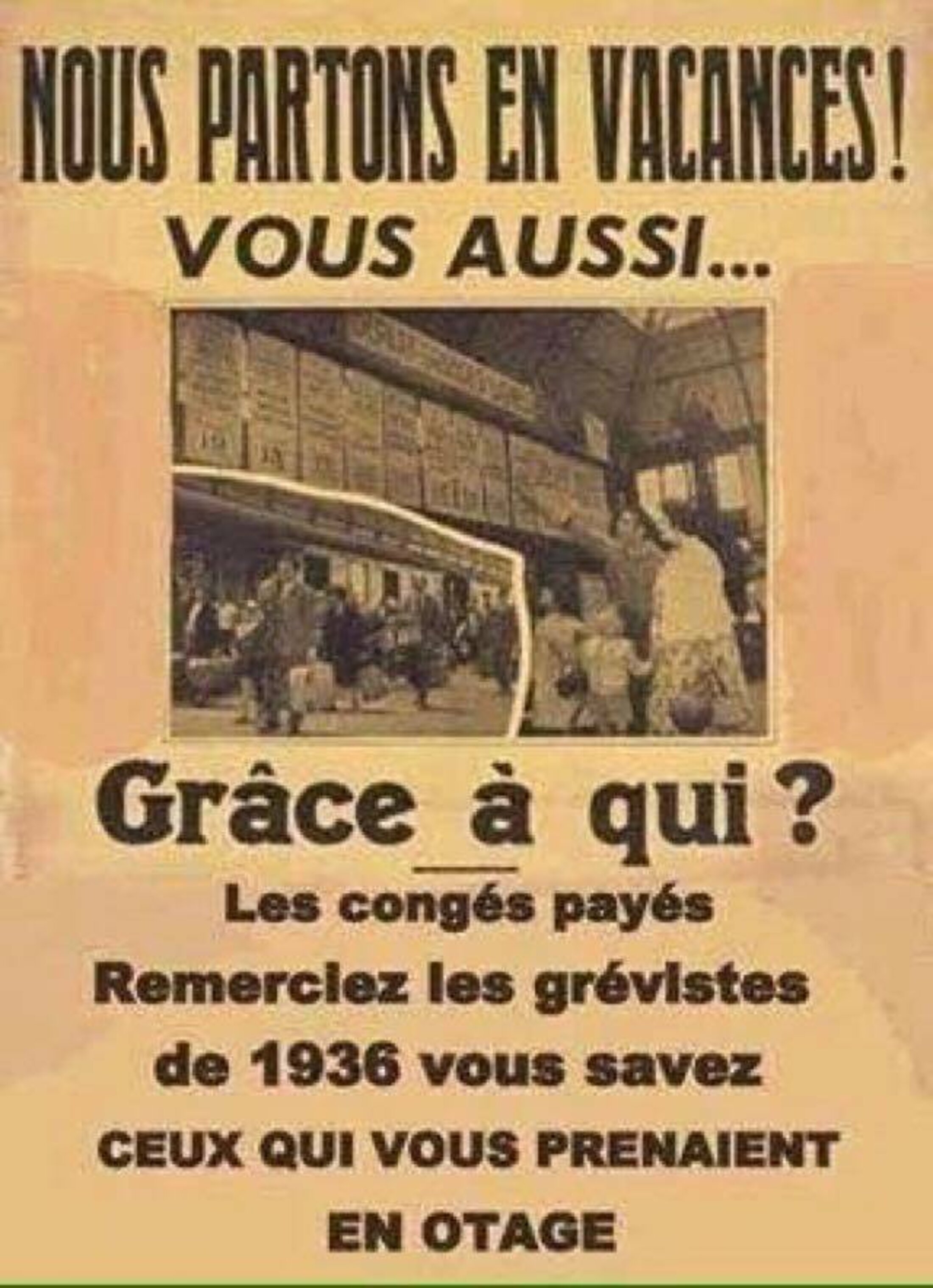 Je ne m’éternise pas sur l’absolue malhonnêteté intellectuelle qu’il y a à parler de « prise d’otage », à peine six mois après le Bataclan. La littérature sur les prises d’otage est énorme, il suffit de lire 10 lignes de témoignage d’un otage pour comprendre. Et, puis, comme le montre le tract, cette expression au sujet des grévistes ne date pas d’hier (quel archaïsme, au passage…). Ce que dit ce tract, c’est que l’action des grévistes profitent à tous les salariés (et, oui. Les ravisseurs partagent leur butin avec les otages, incroyable !!) parce que tous les salariés subissent la gêne, voir les sacrifices corrélés à l’action des grévistes. Tous. Moi, y compris. Comme vous, je me demande comment je vais aller bosser s’il y a plus de métro. Comme vous, ce weekend, je vais rester chez moi ou faire la queue pour avoir mon plein d’essence. Et comme vous, le reflexe primaire c’est de dire « Quelle bande d’enc.. quand même ». Alors, comme vous, j’essaie de penser à des trucs sympas pour me calmer et je fais autre chose, comme par exemple aller sur internet réserver mes vacances, période où je serais enfin loin de tous ces cons qui me pourrissent la vie. Sauf que, ces vacances, pourquoi on me les donne ? On me dit qu’il faut être compétitif et on accepte de me payer 5 semaines par an à rien foutre ?? Gattaz serait le père noël ? Non, j’ai ces congés parce que mes grands-parents se sont battus pour les avoir. Les grévistes, mais surtout, l’immense majorité des salariés qui ont serré les dents pendant 2 mois en mai/juin 1936. Ils étaient comme moi aujourd’hui, ils vivaient dans la pénurie. Enfin comme moi… C’est vrai quoi, ma gêne et mes sacrifices, à moi, sont énormes. Mes weekends et toutes ces heures perdues à galérer, sans parler des congés ou RTT que je dois poser parce que je ne peux pas aller bosser. C’est vraiment chiant au possible. Une vraie galère comparée à la pénurie de farine, de lait, de sucre, de pain qui ont accompagné les grèves de 1936 (Les patrons de PME devaient aussi râler de voir la baisse de leur chiffre d’affaire). Avoir faim c’est rien comparé à galérer deux heures sur un quai de gare. En plus, eux, ils ne pouvaient pas rater Hanouna parce qu’ils étaient bloqués en voulant rentrer chez eux le soir, ils n’avaient pas de télé ces ringards. Non, c’est vrai, finalement, ces « acquis » sociaux tombés du ciel, ça vaut pas le coup de les défendre. Je me demande si on ne devrait d’ailleurs pas les rendre directement, ça nous éviterait tellement d’autres sacrifices (pour les plus motivés, sachez que vous n’êtes pas obligés de poser vos congés. Offrez les donc à votre boss). Et puis, c’est pas comme si ces trucs archaïques avaient avoir avec nos valeurs républicaines …