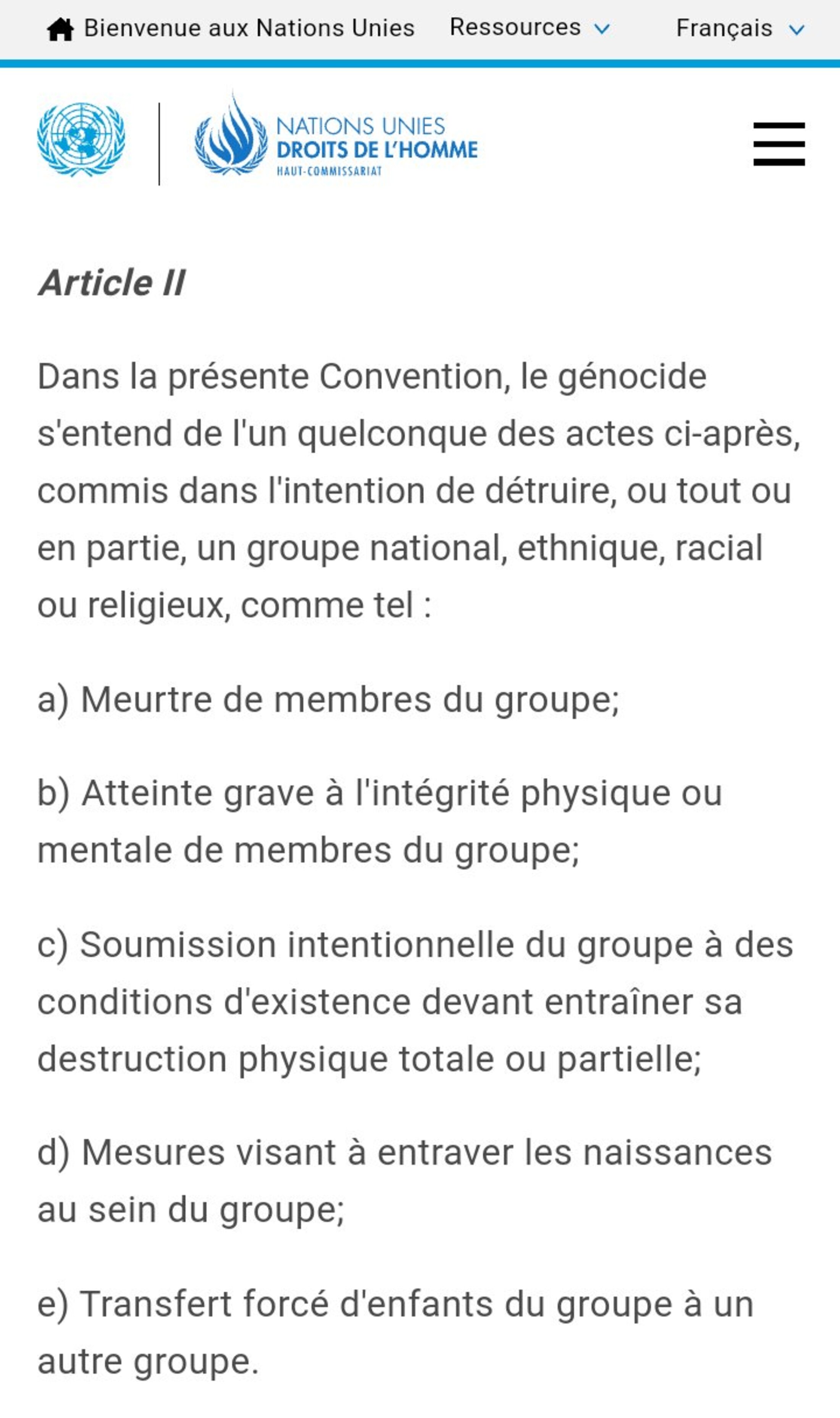Vérifions maintenant la définition d'un génocide. Tout d'abord quelle définition ? La mienne ? Celle du dictionnaire Larousse ou de je ne sais quel tribunal ? Non. La seule définition qui vaille en droit international, celle de l'ONU. Voici ce que nous apprend le site de l'ONU sur la prévention des génocides ( https://www.un.org/fr/genocideprevention/genocide.shtml )