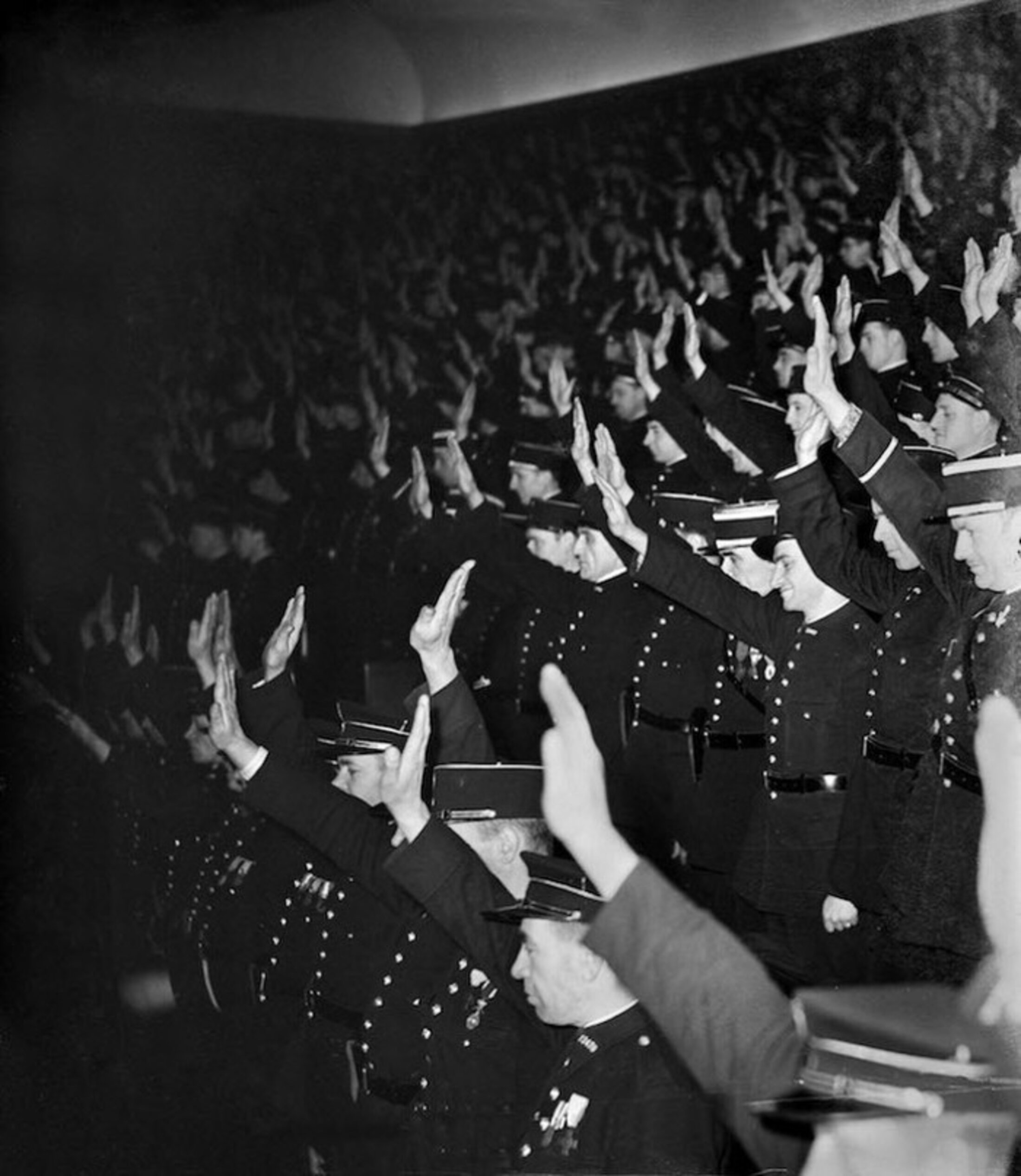 Sous la houlette de Philippe Pétain, l’État français a créé la Police nationale le 14 août 1941. Ici le 21 janvier 1942, les policiers français prêtèrent allégeance à Paris au chef de l’État fasciste. La police française a été impliquée dans l’Holocauste et contre la résistance, fut blanchie après la Seconde Guerre mondiale. Par atavisme historique, cette culture-maison est encore forte en 2023 Agrandissement : Illustration 2