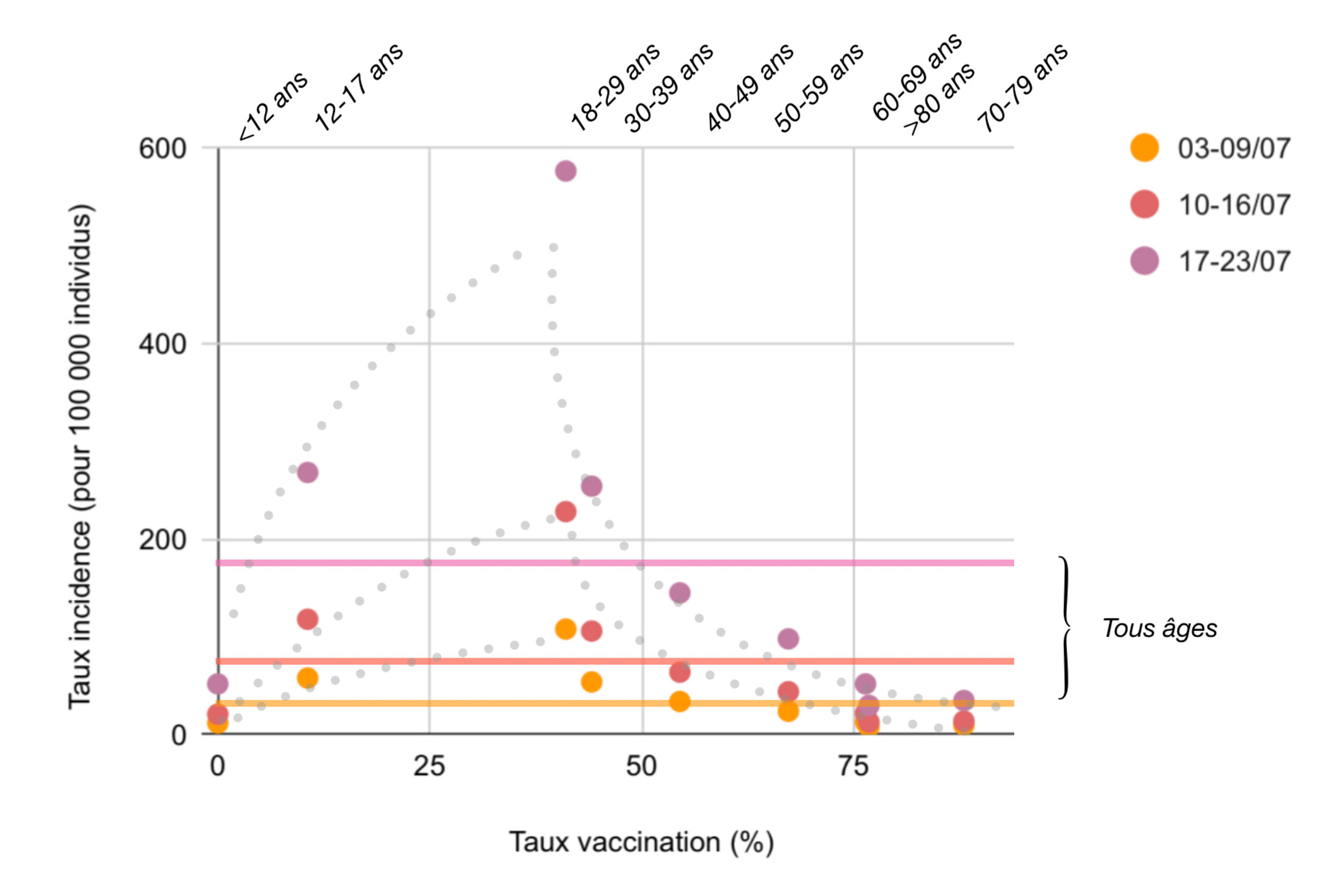 L’étude de la DREES portait sur une semaine seulement, fin juin/début juillet, et nous avons donc poursuivi l’étude des données épidémiologiques issues des dépistages menés durant les 3 semaines qui ont suivi. Dans la figure qui suit, nous pouvons voir que le taux d’incidence global croît progressivement, de manière hebdomadaire. Il vaut respectivement 38, puis 74 et enfin 177 (pour 100 000 individus testés) du 3 au 9, puis du 10 au 16 et enfin du 17 au 23 juillet 2021. Aussi, celui-ci n’évolue pas de manière homogène en fonction des classes d’âges et des taux de vaccination croissants. On constate en effet pour une même semaine (par ex. du 10 au 16 juillet) un maximum pour les 18-29 ans (taux d’incidence hebdomadaire de 228 pour 100 000 pour cette période), présentant par ailleurs un taux de vaccination voisin de 40 %, puis une rapide diminution dans les groupes augmentant ensuite en âges. Cette « cassure » systématique dans les séries, quelle que soit la semaine considérée, s’explique probablement par l’immunité progressivement croissante, mais aussi certainement par des contacts et une mobilité accrus, en particulier au sein des groupes d’âges les plus jeunes, en période estivale.