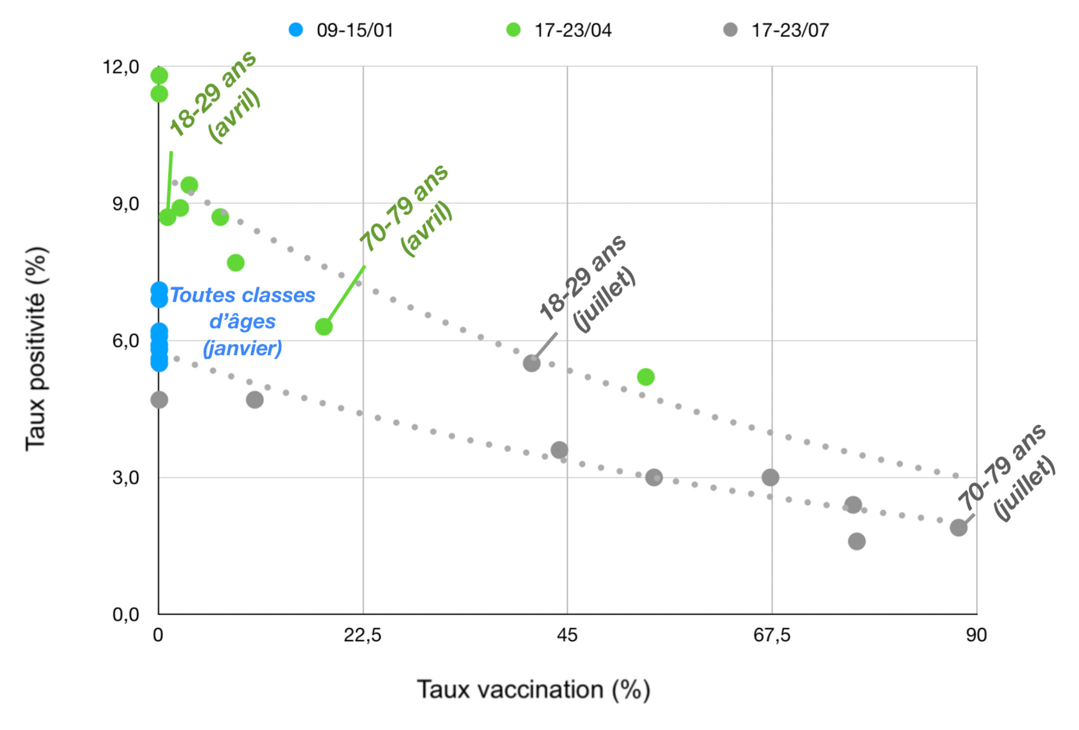 Lorsqu’on s’intéresse aux taux de positivité (nombre de cas positifs au Covid sur l’ensemble des individus testés sur une durée donnée, qu’ils soient symptomatiques ou non), nous remarquons une baisse de cet indicateur avec l’augmentation de la couverture vaccinale. Ainsi, dans des groupes de moins de 30 ans, par ailleurs peu vaccinés à cet instant (taux de vaccination moyen de l’ordre de 20 %), le taux de positivité est systématiquement 2 fois plus élevé que chez les personnes de plus de 60 ans et vaccinées à plus de 75 %, durant chacune des trois premières semaines de juillet.