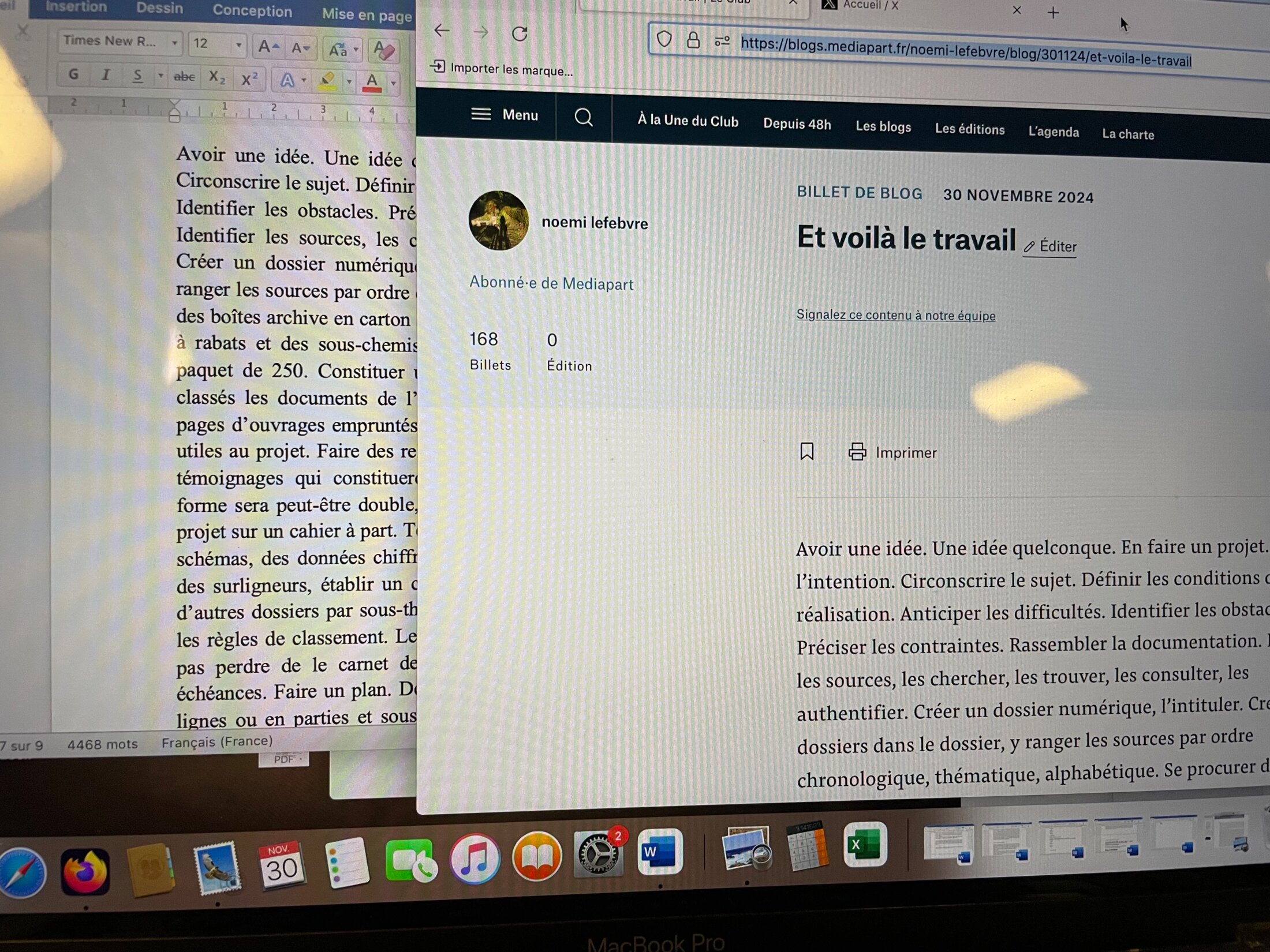 Avoir une idée. Une idée quelconque. En faire un projet. Préciser l’intention. Circonscrire le sujet. Définir les conditions de réalisation. Anticiper les difficultés. Identifier les obstacles. Préciser les contraintes. Rassembler la documentation. Identifier les sources, les chercher, les trouver, les consulter, les authentifier. Créer un dossier numérique, l’intituler. Créer des dossiers dans le dossier, y ranger les sources par ordre chronologique, thématique, alphabétique. Se procurer des boîtes archive en carton standard, une dizaine de chemises carton lustré rigide à rabats et des sous-chemises recyclées couleur pastel 22x31 cm vendues par paquet de 250. Constituer un dossier physique et des sous-dossiers, où seront classés les documents de l’âge de l’imprimerie : photocopies d’archives et de pages d’ouvrages empruntés, articles de journaux, écrits manuscrits ou tapuscrits utiles au projet. Faire des relevés de terrain. Mener des enquêtes. Enregistrer des témoignages qui constitueront l’essentiel du sous-dossier “enquêtes”, dont la forme sera peut-être double, numérique et papier. Utiliser le smartphone pour les photos et enregistrements, ne pas oublier de les trier et de les ranger par catégories du plus intéressant au plus anecdotique. Ne pas faire de doublons. Supprimer tous les brouillons au fur et à mesure et toutes les photos ratées bien sûr, sauf si elles ont une valeur poétique ou heuristique. Prendre des notes à propos du projet sur un cahier à part. Tenir ce carnet de bord avec application. Envisager des schémas, des données chiffrés, des graphiques, des tableaux. Prévoir des post-it, des surligneurs, établir un code-couleurs. À mesure que le projet avance, créer d’autres dossiers définis par sous-thèmes. Créer un document où seront indiquées toutes les règles de classement. Le recopier sur le carnet de bord (ou inversement). Ne pas perdre le carnet de bord. Organiser le temps de travail. Prévoir des échéances. Faire un plan. Définir des chapitres. En prévoir la teneur en quelques lignes ou en parties et sous-parties. Fixer un nombre de pages minimum et un nombre de pages à ne pas dépasser, estimer le temps nécessaire à l’achèvement du projet, se soucier du lieu, des conditions et du moment de la publication. Ouvrir une page word. Écrire. Enregistrer sous un titre. Écrire. Enregistrer régulièrement sous le même titre. Sauvegarder l’écriture sur un disque externe une fois par semaine. Par exemple le samedi. Et ce jusqu’à la dernière phrase. Écrire le mot fin, ou pas, on s’en fout. Et voilà. Ce protocole, sorti des cuisines de Flaubert, a été amélioré par des générations de maniaques de l’organisation et de conseillers en art d’écrire sans faire d’erreur, et régulièrement mis à jour à mesure des révolutions technologiques et du développement de bienveillants mécanismes de contrôle des usages du langage, ce qui permet d’affirmer qu’aujourd’hui, grosso modo, il constitue un modèle quasiment infaillible, bien que toujours améliorable.