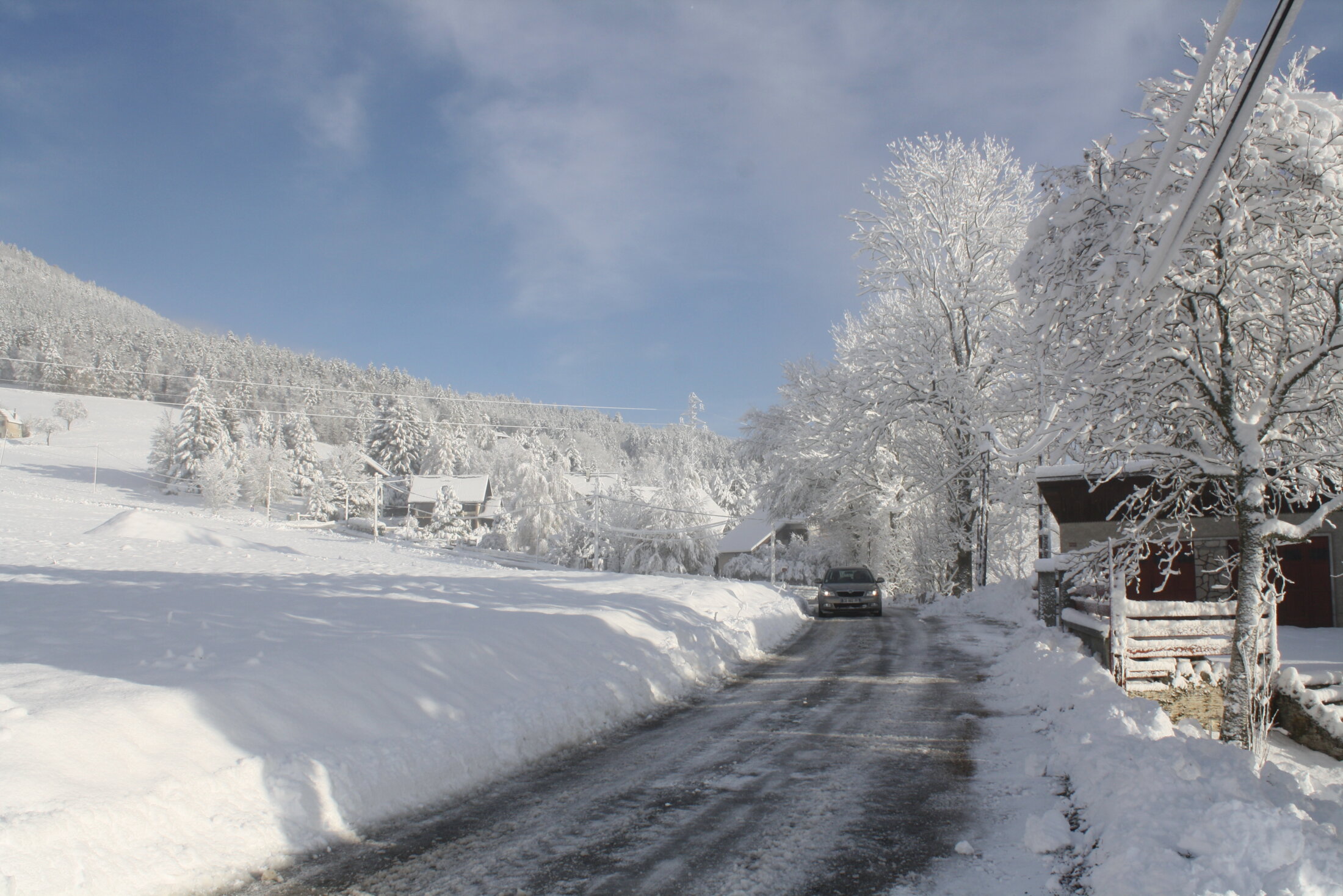 Plus loin, le chasse-neige repousse la poudre en murs verticaux le long du chemin. Au volant un agriculteur retraité. Il arrondit son pécule. Les matins de grosse tombée il se lève avant le jour pour dégager les maisons, notamment celle de ma voisine Jaja, 88 ans, pas très en forme, mais qui refuse l’EPAHD, et qui restera dans son petit chalet jusqu’au bout.