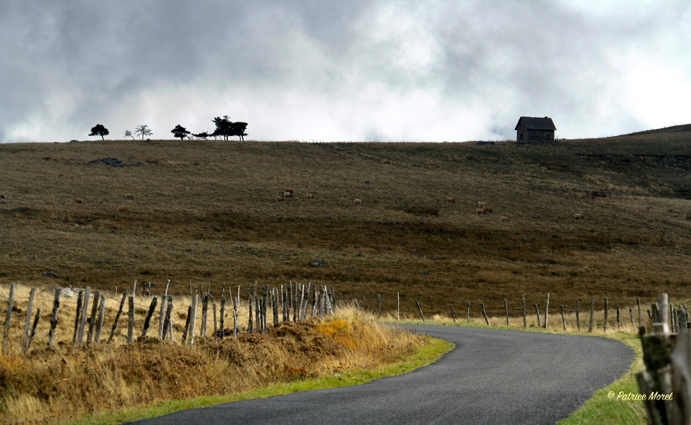 Je vous ai déjà parlé, en février dernier, de cet Aubrac sacré où les hivers sont parfois sibériens, quand la burle siffle, souffle, et glace les pâturages, dresse des congères, congèle les routes et pétrifient les chaumières. Actuellement, il fait plus doux : octobre est blond, novembre sera rocaille. Les pèlerins de Compostelle cheminent sur ces hauteurs désolées, entre les longs murs de pierre, personnages lointains, penchés et patients, ombres chinoises émouvantes, lentes, traînantes, sur fond de nuages et de vallons dénudés.