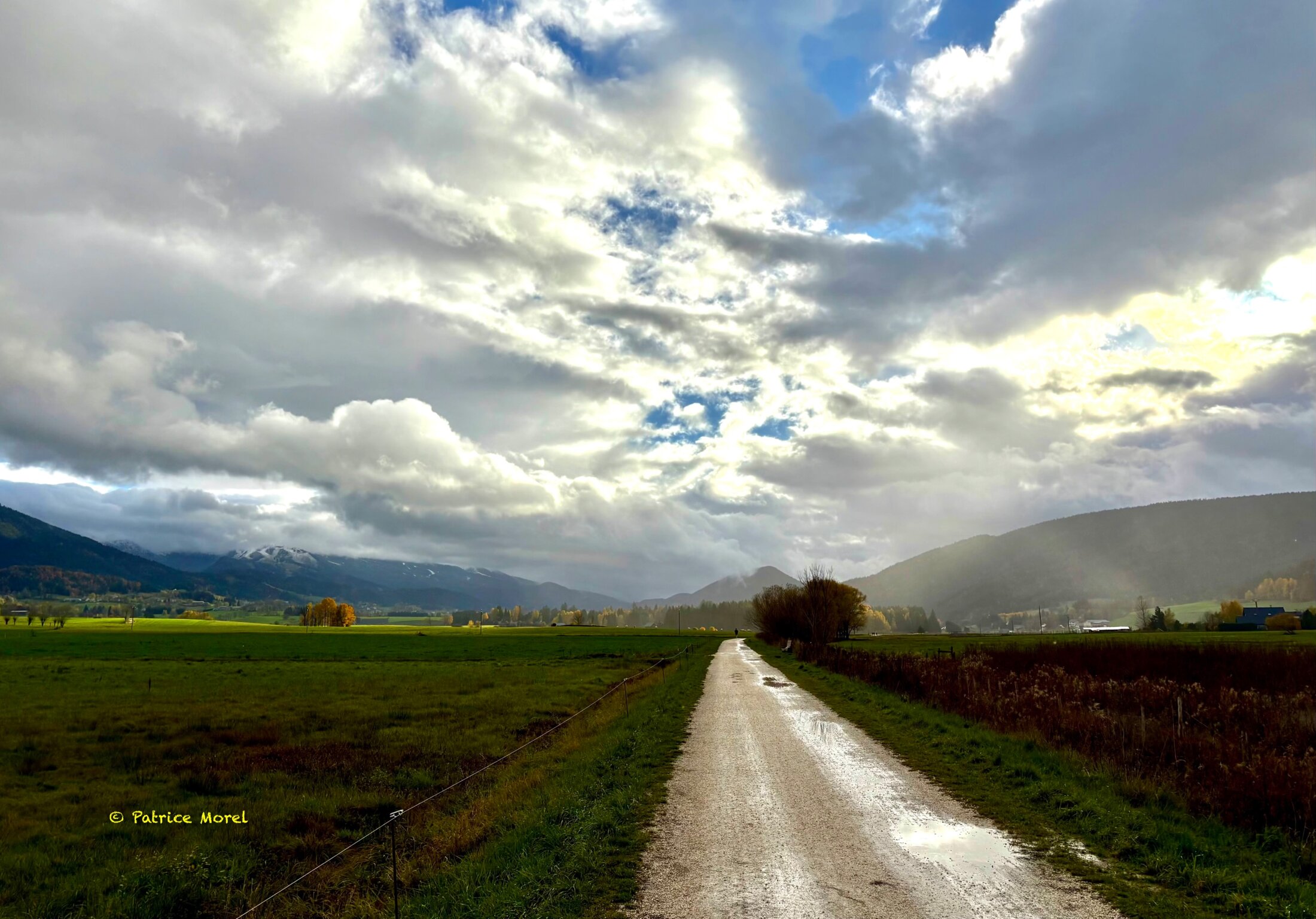 C’est un endroit où j’adore marcher. Pourtant le parcours est quasi rectiligne. Mais le paysage alentour, les montagnes en découpe céleste, les forêts sombres et la vaste prairie humide, calment toute angoisse. J’avance droit, ferme, obstiné, au rythme de ce que j’écoute.