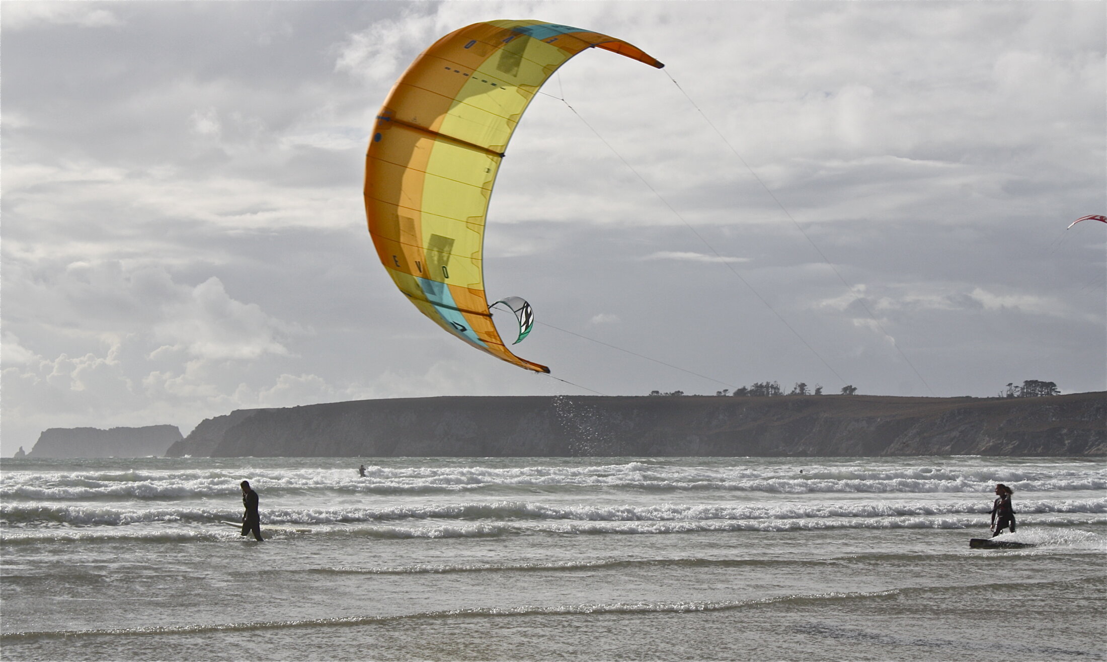 Dylan nasille et gratte, il me guide sur le sentier de la plage. Entre fougères et ronciers la piste devient «highway 61», le paysage s’impose, grandiose, sable, falaises, océan, j’oublie Erdogan, je zappe le Kremlin, je marche pieds nus, les coquillages s’étalent à perte de vue, les oiseaux de mer sont aux affaires, penchés sur les algues à la traîne, et surtout des dizaines de papillons colorés flottent entre liquide bouillonnant et nuages turbulents : ce sont des humains éthérés, suspendus aux souffles marins, danseuses et danseurs contemporains exécutant un ballet unique, citoyennes et citoyens en combinaison noire oubliant les affres du quotidien, black blocs non violents, très mobiles, jaillissant ici, bondissant là, manifestants pacifiques sous banderoles arc-en-ciel, libres sous pavillon de plaisance, la paix en étendard, tous anars, tous le panard ! Et je crois savoir ce qu’ils pensent : ils conchient les crétins qui nous dirigent !
