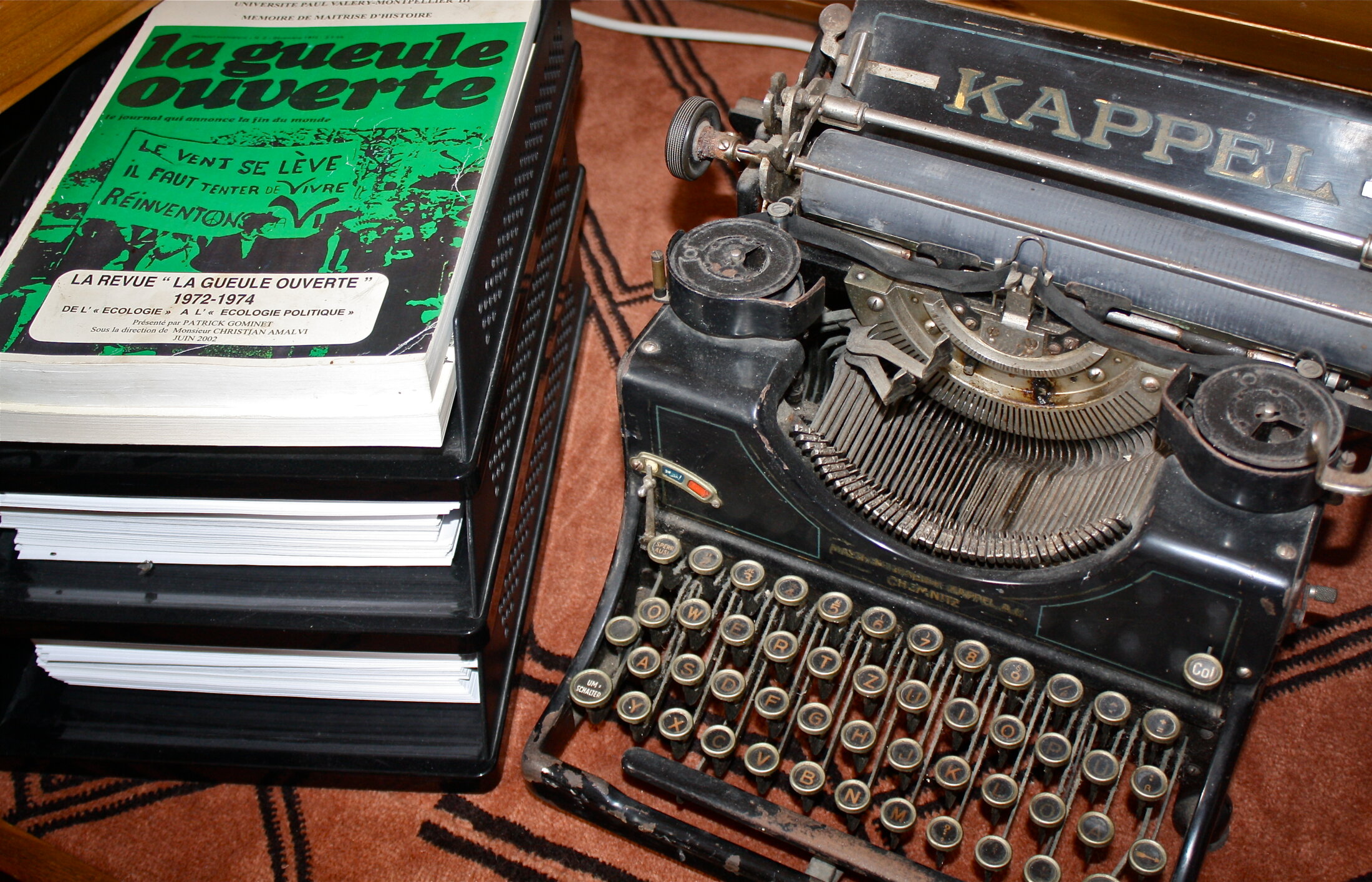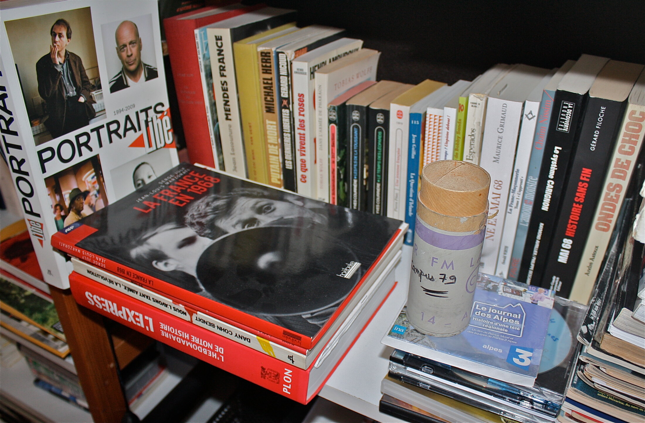 Je m’y réfugie comme dans une zone à défendre, une ZAD d’altitude avec son trésor escarpé : le mur du fond ! Il y a là un rempart contre la solitude, une cloison d’humanités, une muraille où je chine et m’échine : livres, atlas, brochures, revues, archives, bibelots, claviers, boîtiers, vinyles du siècle dernier...
