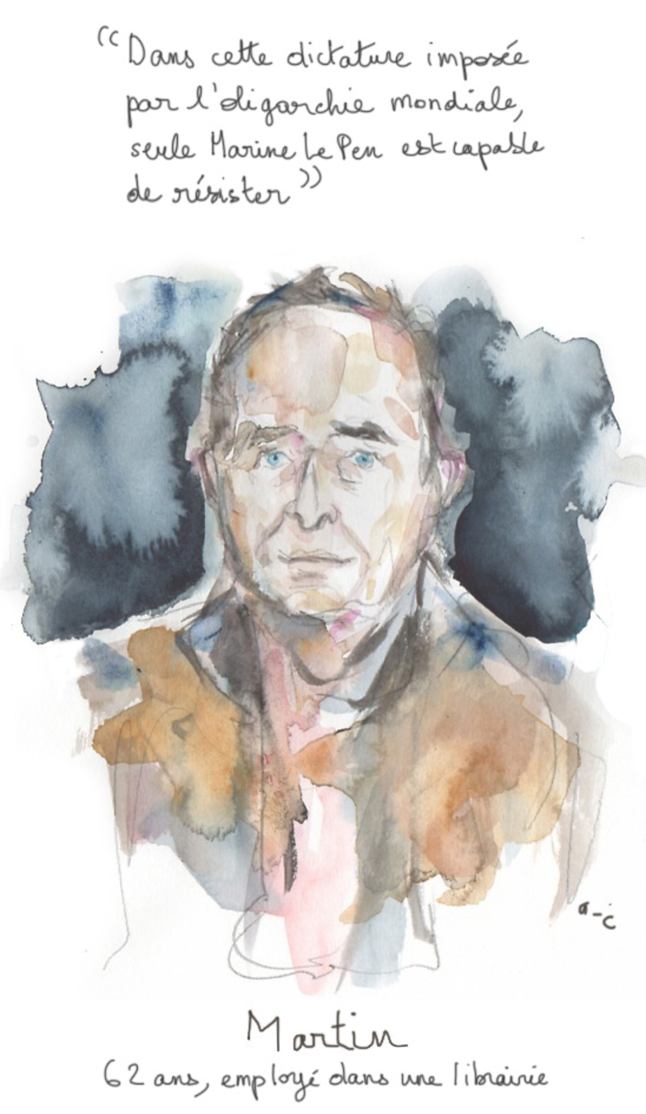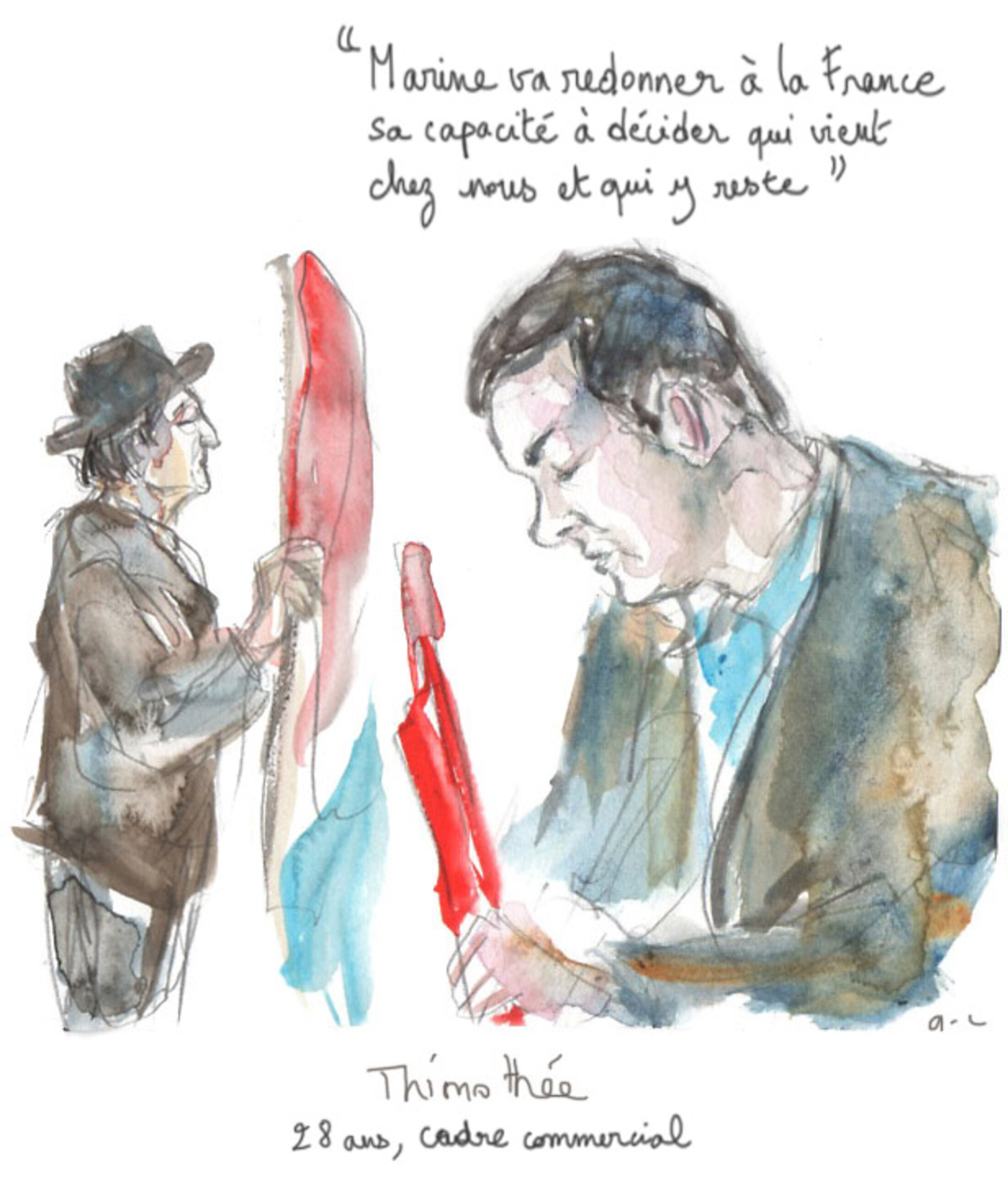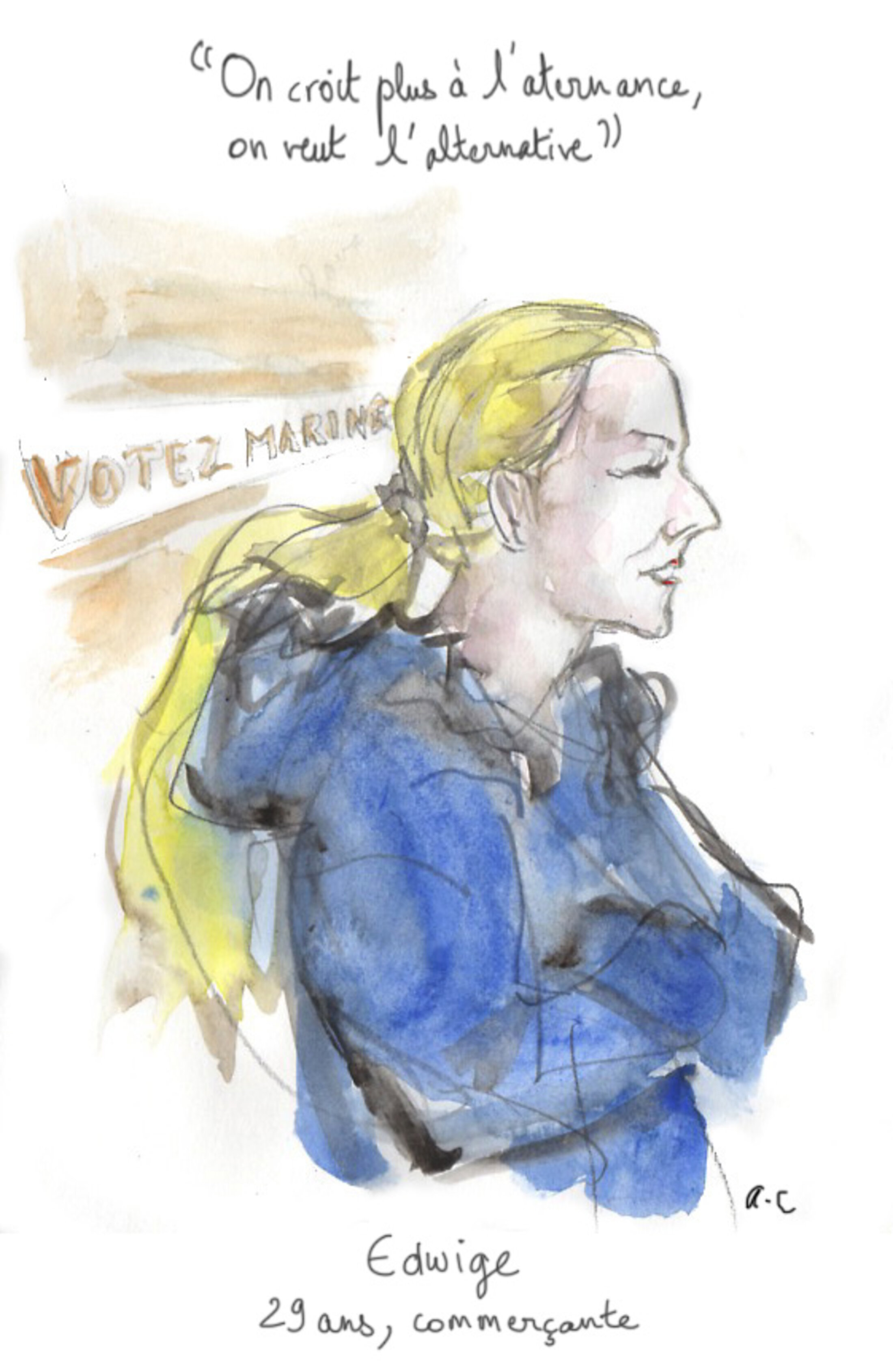 A tous ceux que je rencontre je commence par poser la même question. "Soutenez-vous Marine Le Pen et si oui pouvez-vous me dire en une phrase pour quelle raison ?". Et c'est cette phrase que la dessinatrice a reportée sur son dessin.