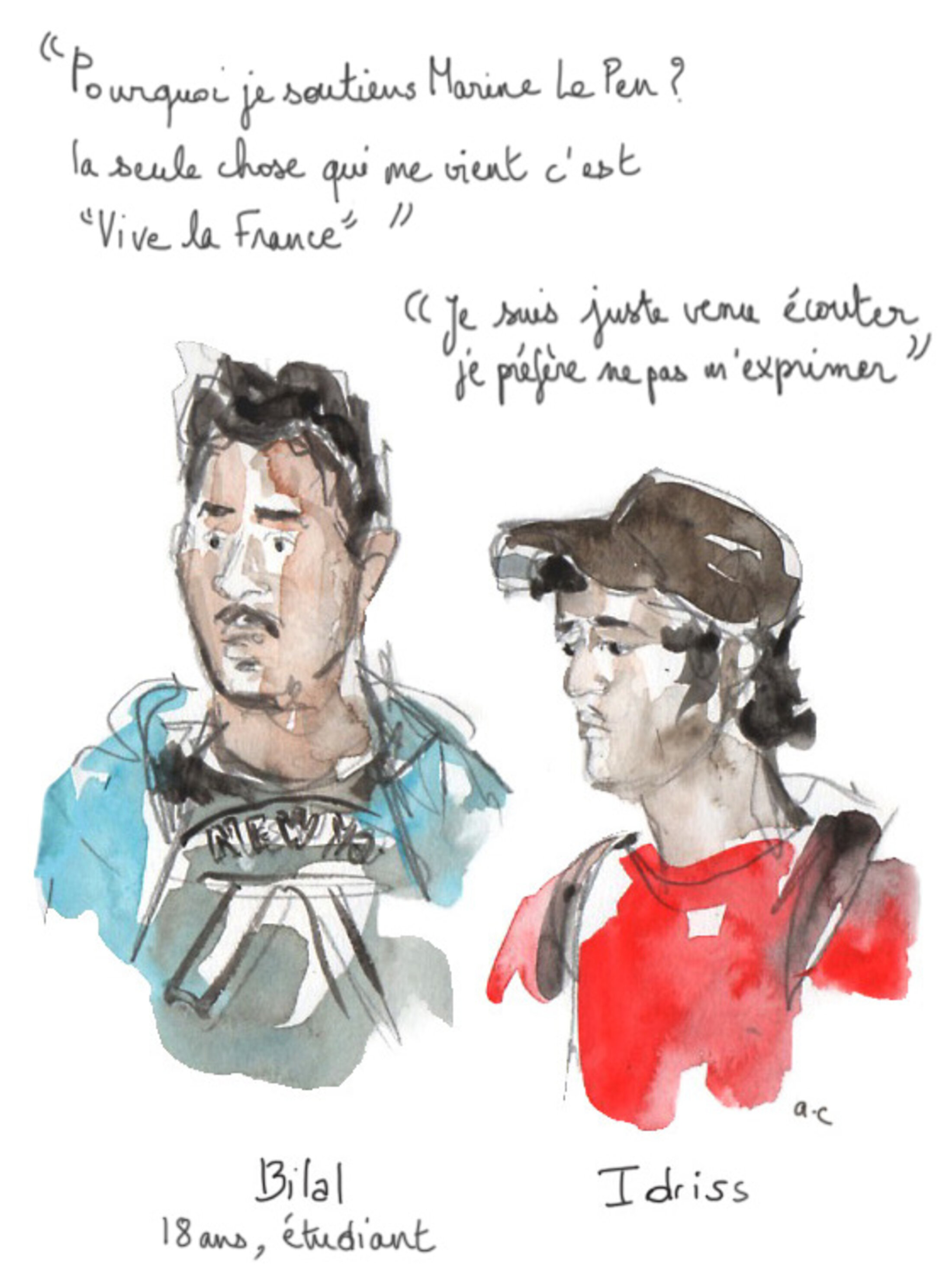 Diversité de générations, et même (mais à un degré moindre) diversité "ethnique". On trouve (ce n'est pas un scoop mais ça frappe toujours) des noirs et des arabes dans les meetings du Front. Pas beaucoup, mais quand même. Je croise Bilal et Idriss, tous deux lycéens. Le premier est convaincu, le second circonspect.