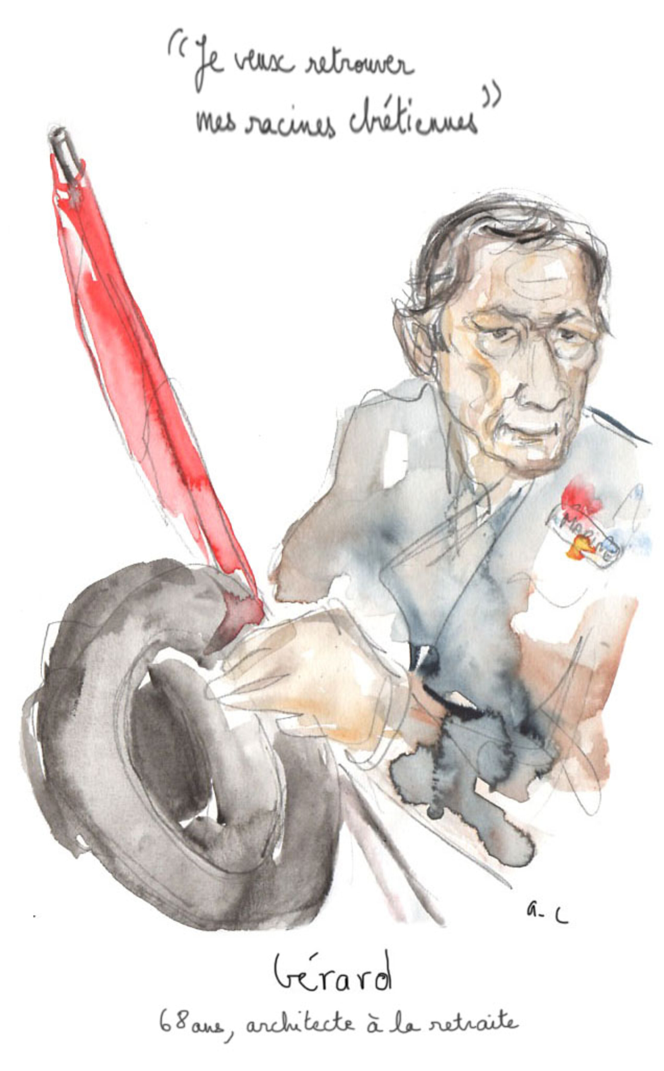 Il explique donc son engagement pour le Front National par la recherche de ses racines chrétiennes et la défense de la famille: "Je suis contre la GPA (note: gestation pour Autrui) et la PMA (note: procréation médicalement assistée). Quoi vous ne savez pas ce que c'est? (c'est son seul moment de légère indignation de l'entretien). Mais c'est la fin de la famille monsieur!". Ses racines ne sont pas seulement chrétiennes puisque sa mére était vietnamienne. Il se dit "Français par filiation", et non pas "Français de papier" comme certains Africains ou Maghrébins. "Etre Français ça s'hérite ou ça se mérite, c'est une phrase de Marine". Gérard est architecte et taxi trois fois par jour, à 68 ans, "à cause de ma retraite toute petite". Il tient donc d'une main ses deux drapeaux, et de l'autre un chapeau noir: "Je l'ai acheté 30 euros sur un marché. Quand je vois tous ces jeunes avec ces casquettes vissées derrière la tête, qui sont ridicules, je me dis pourquoi pas un chapeau? ".