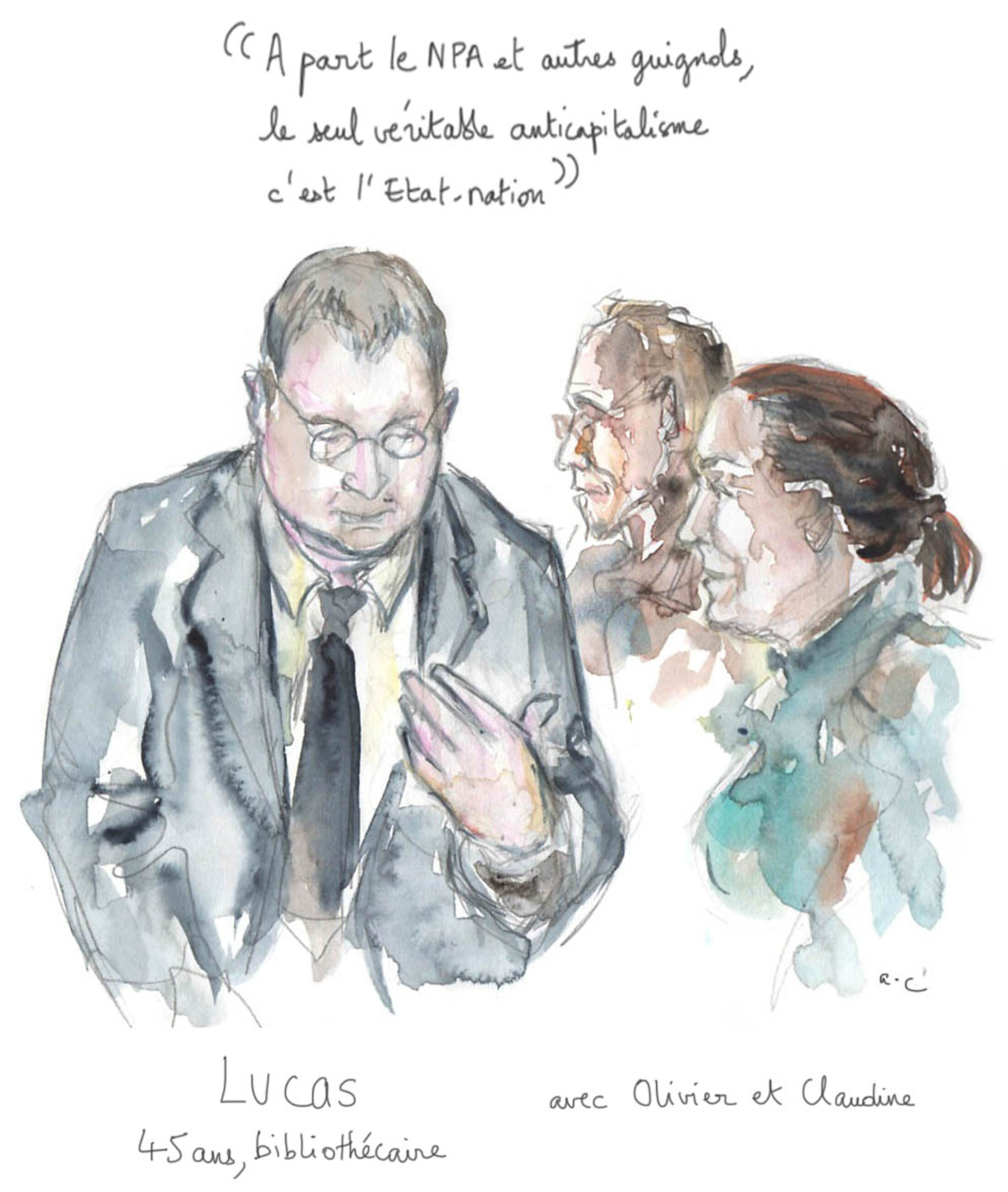 Avec Thibault, j'ai touché du doigt une sorte de violence rentrée. Avec Lucas et ses amis, je suis confronté à une violence froide et intellectualisée. Lucas est bibliothécaire. Adhérent du Front National, il est venu avec deux membres de sa section, Olivier et Claudine. Ça commence doucement. Lucas évoque les raisons économiques de son vote pour Marine Le Pen: l'anticapitalisme. Ensuite, couche après couche, son discours révèle progressivement ses arêtes.