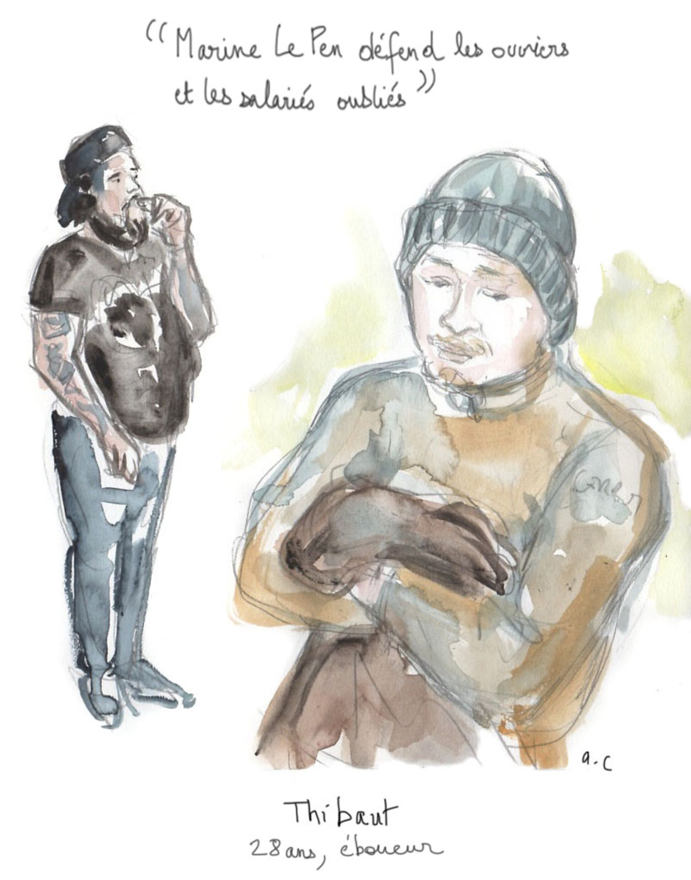 La violence, je vais quand même finir par la rencontrer. La violence rentrée, d'abord. Le discours de Marine le Pen vient de commencer. J'en capte des bribes (des phrases comme "Le projet Macron porte atteinte à la liberté", des expressions comme"la subversion migratoire"..). Les interviews deviennent plus difficiles, plus hachées, les gens sont absorbés dans l'écoute de leur chef. La violence, donc. Je repère un jeune homme à l'attitude un peu butée. Il hésite à me parler et à me dire son nom. Il s'appelle Thibault, il est éboueur. Je sens que sa patience a des limites. J'ai tout juste le temps de lui demander pour qui il a voté en 2012: "Le Pen". Et en 2007 ? "Le Pen. J'ai jamais voté que Le Pen". Et dans sa famille? "C'est différent". Il parle en desserrant à peine les dents et les mots qui sortent de sa bouche semblent maculés de colère. Mais il ne m'envoie pas me faire voir. A moins peut-être, que je ne parte juste au bon moment...