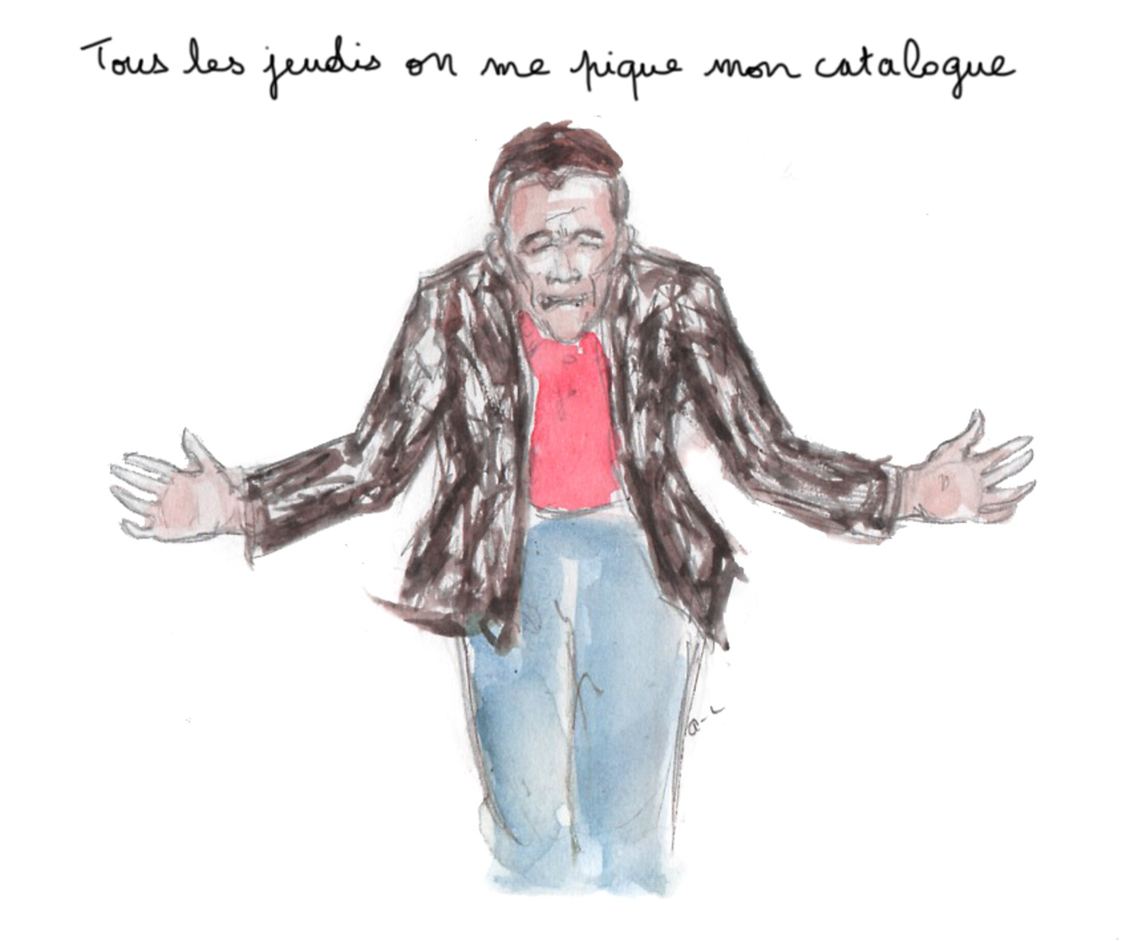Bref Monsieur Fraize, avec ses silences cotonneux, son air embêté, son pantalon trop court, avait fracassé cette émission. Lui s'en était sorti sans une égratignure, sans une tache, et sans avoir touché aux pommes de terres au lard. Ayant trouvé sa prestation magnifique, ébouriffante, bouleversante, j'ai tiré par la manche ma collègue dessinatrice Annie-Claire Alvoët pour aller du côté des feux de la Rampe, Paris 9e, où ce drôle d'oiseau est visible tous les jeudis.
