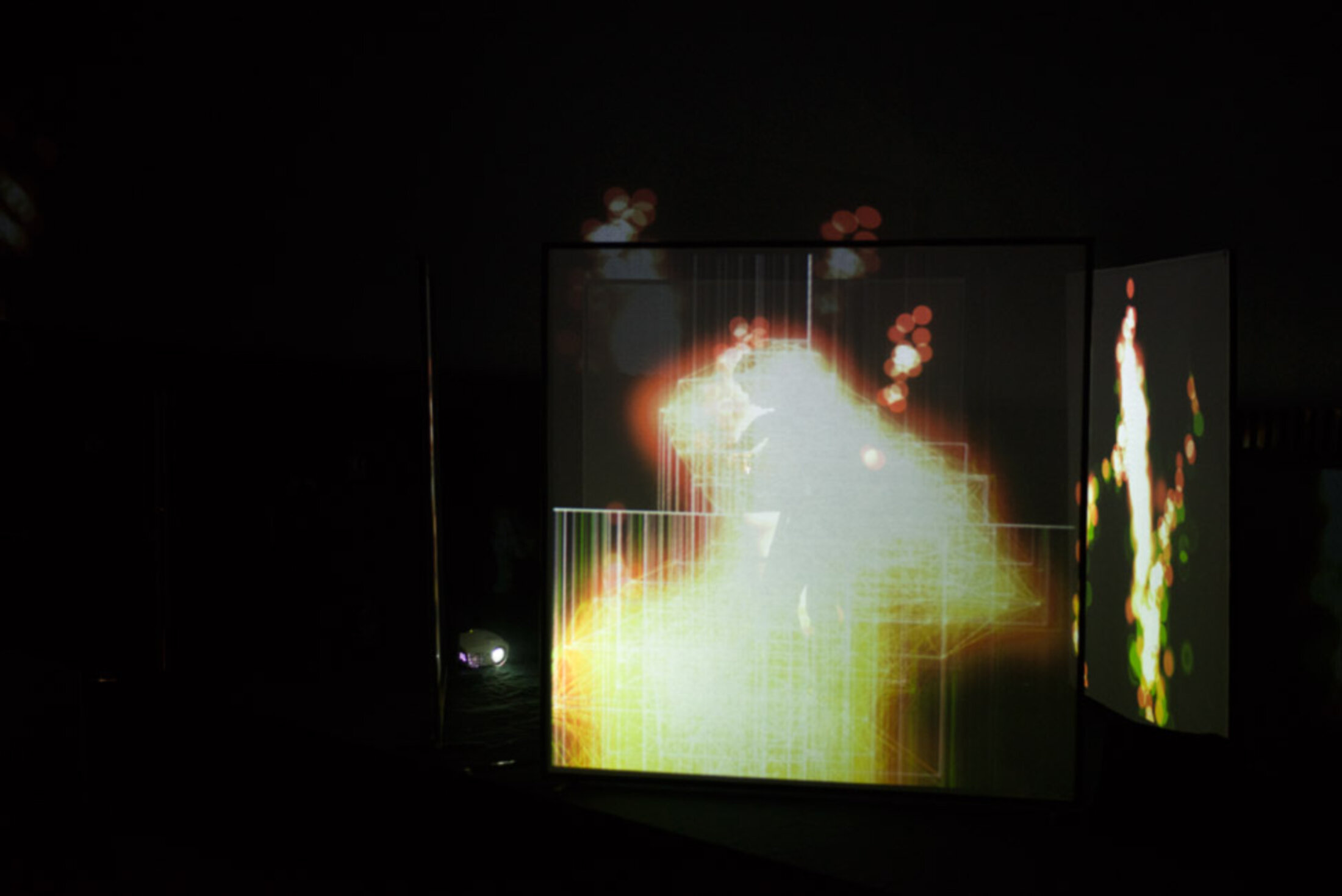 Ils sont partout, dans les V qui se forment, dans les courbes qui s’accélèrent, dans les envolées de la musique également. On assiste à un voyage, un voyage surprenant, épileptique parfois, digital toujours, tout en rouge-orangé dans la salle noire.
