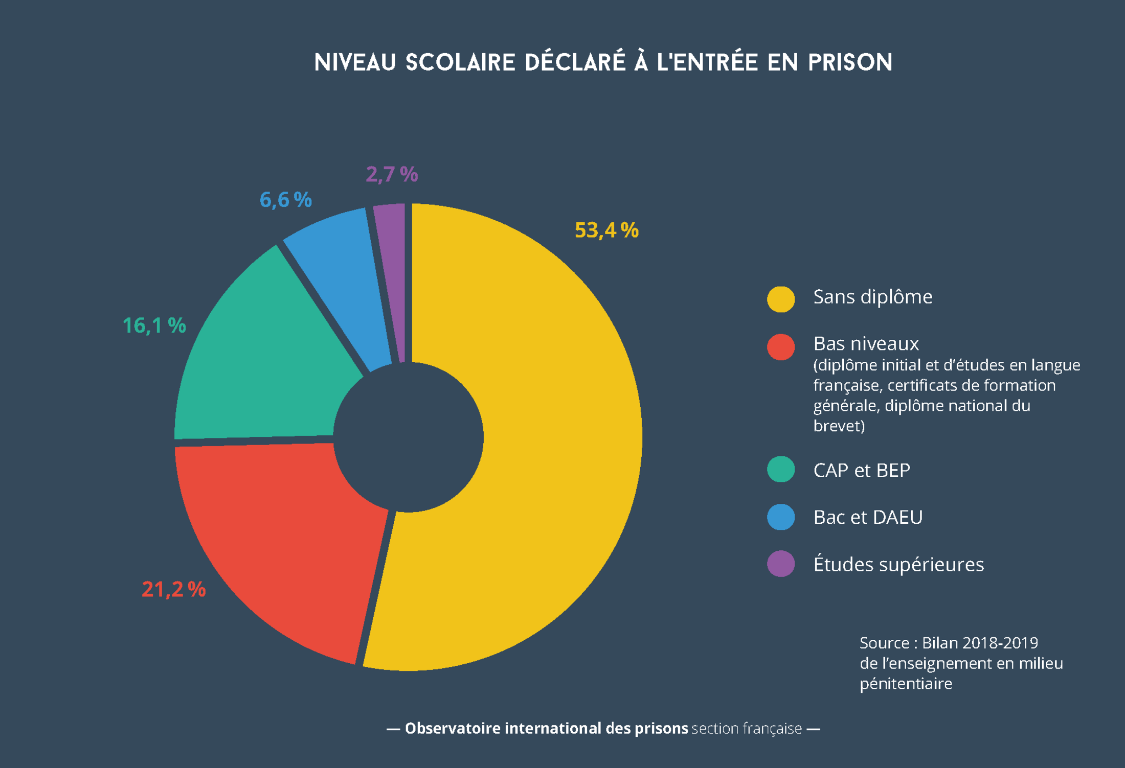 (2) Bilan annuel de l’enseignement en milieu pénitentiaire 2018-2019. Ces chiffres, en réalité issus d’une enquête auprès des détenus scolarisés, semblent, d’après la DAP, pouvoir être généralisés à l’ensemble de la population détenue. Une mesure plus précise du niveau de qualification de l’ensemble de la population pénale hébergée serait actuellement à l’étude.