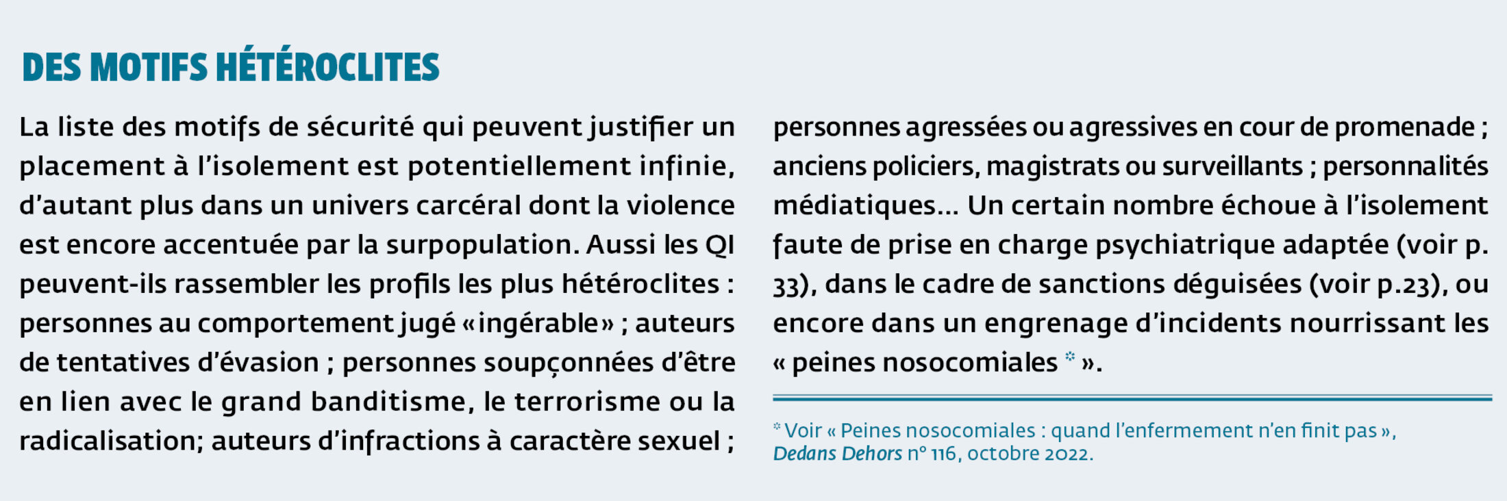 Et si la porosité est telle, n’est-ce pas parce que certains quartiers spécifiques reprennent de larges pans de l’isolement ? Nombreuses sont en effet les personnes qui y sont placées à témoigner de conditions de détention qui s’apparentent fortement à celles d’un QI : « Tu es dans un isolement total, tu ne parles avec personne », souffle Monsieur I., incarcéré à l’UDV de Lille-Sequedin. « À part les trois détenus de notre groupe, on n’a aucun contact avec les autres, si ce n’est les discussions à la fenêtre, sans se voir physiquement », décrit pour sa part une personne détenue en QER[14]. « Avant, il y avait un voire deux QI par établissement, mais avec la création des QER, UDV et autres, l'isolement s'est répandu, estime elle aussi Charlotte Haguenauer, psychologue intervenant à la maison d’arrêt de Nanterre. Certains détenus vont quitter le QI pour un quartier spécifique mais conserver les mêmes symptômes, le même ressenti, et le même vécu de stigmatisation. »