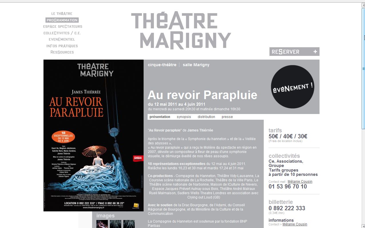 Certains théâtres parisiens se lamentent parce qu’ils peinent à remplir leurs salles. Qu’ils songent donc à mettre en pratique des pratiques tarifaires plus justes. Et de manière ambitieuse, et pas 10 malheureux strapontins tous les 36 du mois ! Quand je vois que le spectacle du génialissime James Thierrée, au Théâtre Marigny, est à 50€… je trouve ça juste indécent. (Les billets pour les 18 dates (= 18 000 places) vont se vendre en un rien de temps, j'en mets ma main à couper). Enfonce-je des portes ouvertes en signalant que le théâtre n’est pas indiqué pour les pauvres ? Les gens modestes n’ont qu’à se satisfaire des places les moins chères (à 30€ quand même). Ok, un théâtre privé, ça coûte très cher à entretenir (loyer, communication, salaires, électricité et tenues aussi élégantes qu’inutiles). Je lisais récemment une interview de Pierre Arditi qui n’a cure des querelles de chapelles entre théâtre privé et théâtre public. Son idée – et je m’étonne qu’elle n’ait été reprise – consistait à réserver un contingent de places à très bas prix dans tous les théâtres privés parisiens. Et pas des places "aveugles", derrière un poteau, ou au fin fond de la salle.(Si par extraordinaire la suite vous intéresse, c’est à lire en cliquant ici. Merci pour votre curiosité.)