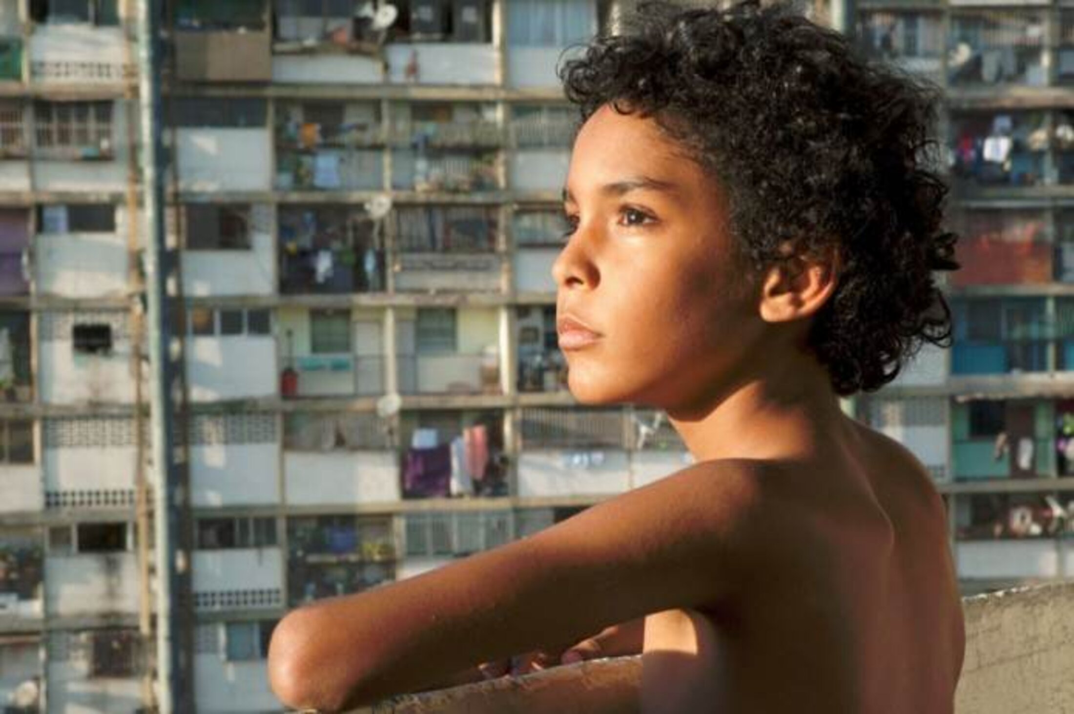 Pelo malo est ancré dans les espaces confinés et bruyants d’un quartier pauvre de Caracas. Des barres d’immeubles très hautes, des coursives délabrées où jouent les enfants. Ce lieu de relégation est le théâtre d’une vie sociale apparemment dense, très présente à l’oreille, mais où des signes d’une rupture des liens sociaux se manifestent crûment. On entend des coups de feu, le soir. Le photographe du quartier refuse de faire crédit aux enfants alors qu’il prend ses photos avec un smartphone relié à un ordinateur, ce qui ne suppose pas de frais excessifs. La voisine, nourrice des enfants de Marta, mère de la seule amie de Junior, refuse de garder son nourisson de peur de n’être pas payée… “Je ne peux pas le garder, si tu ne me paie pas” dit-elle, désolée … Elle travaille à domicile et n’hésite pas à mettre Junior à la porte lorsqu’il fait trop de bruit dans la chambre de sa fille. Marta, la mère, ne se montre jamais tendre avec son fils qui constitue pourtant sa principale préoccupation. Seul le beau jeune homme qui tient l’épicerie ad hoc logée dans un kiosque au bas des barres, semble animé de générosité. Il distribue à Junior et à crédit, des boîtes d’allumettes que l’enfant utilise pour créer des figures longues et épluchées, des silhouettes à la Giacometti, qu’il dispose savamment sur les ouvertures carrées qui ajourent la rambarde de la coursive… Il crée ainsi des installations in situ … La générosité rend créatif…