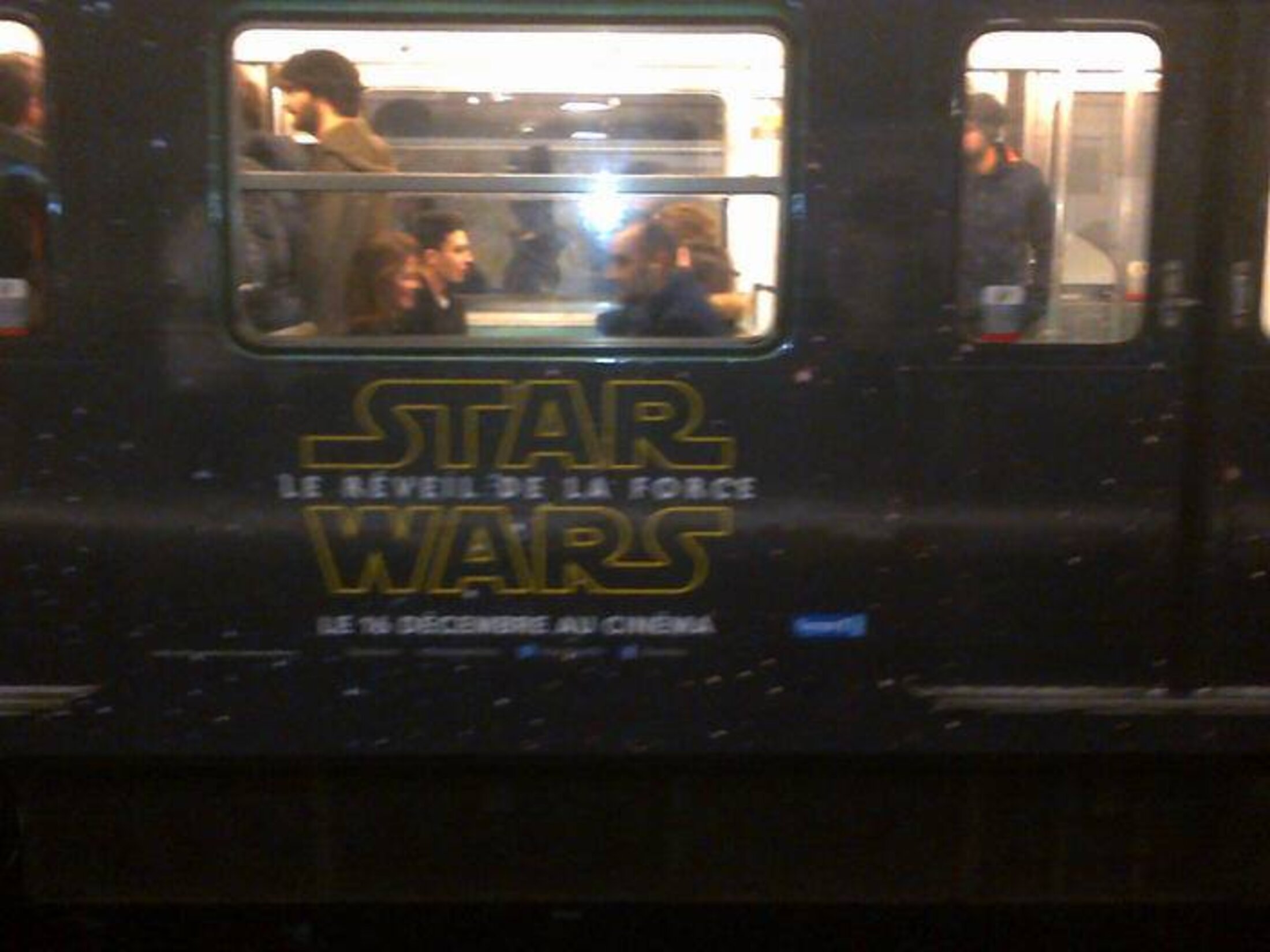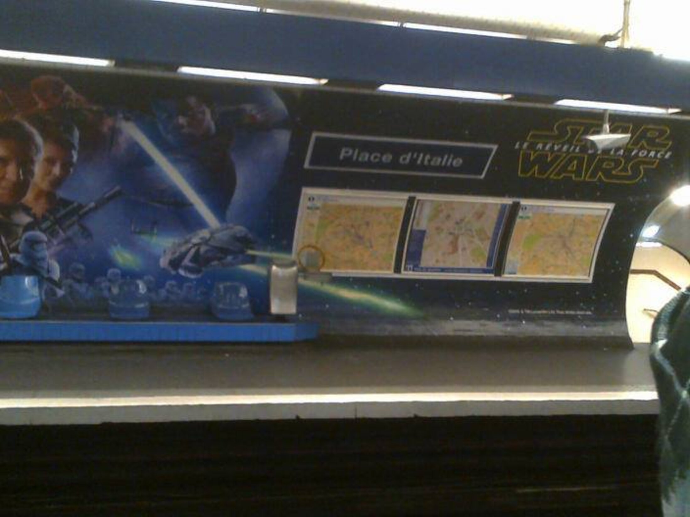 A Paris, sur la ligne 6, la station Place d'Italie et des rames de métro entièrement peintes aux couleurs de Star Wars qui sort le 16 décembre … film anti-impérialiste qui se présente avec son imperium visuel… La fresque occupe l'espace devant elle, elle régit les corps, colonise l'espace public, avale les regards... Parfois elle peut les rendre plus libres, en disposant une alternative au choix du spectateur, comme dans la salle des neuf à Sienne, où Lorenzetti a peint la fresque dite du bon et du mauvais gouvernement. Parfois elle trompe l'oeil pour mieux éveiller et détromper le regard, comme celle d'Andrea Pozzo au plafond de l'église St Ignace de Loyola à Rome... mais ici, bien que nous soyons Place d'Italie, point de recul ni de choix, la fresque ne nous éveille pas mais nous requisitionne, elle se penche sur nous et nous enveloppe, impossible de ne pas avoir le sentiment de lui être offerts par la RATP ... les subtilités de la peinture renaissante sont loin, on est plutôt chez Orwell. Il s'agit d'une démonstration de la force brutale du marketing total, qui se substitue au paysage, alors que les spectateurs ont déjà réservé leurs places et que le film est un tel "phénomène de société" qu'il n' a pratiquement plus besoin de s'annoncer…