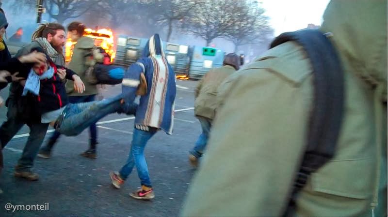 Photo d'Yves Monteil, Citizen Nantes. Julien écrit: "Je suis une des personnes qui ont secouru et emmené Quentin dans un garage souterrain après l’avoir porté, pendant que les CRS continuaient à nous tirer dessus avec des Flash-Ball, des grenades assourdissantes, des fumigènes. Ils étaient a trente mètres de nous, alors que nous étions seulement 5 ou 6 personnes dans cette rue, à essayer tant bien que mal de mettre Quentin à l’abri des tirs."
