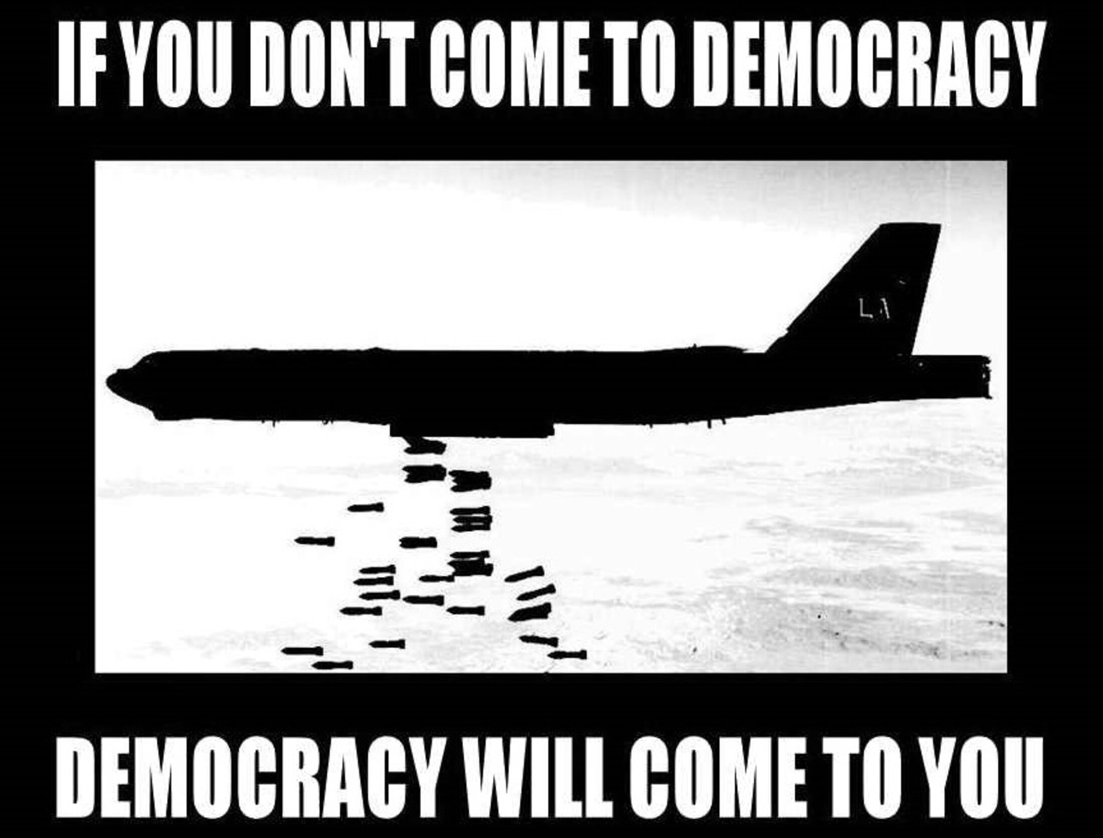 La démocratie telle que nous l’entendons, c’est donc un combat quotidien: contre soi-même d’abord, mais aussi contre certains préjugés qui ont la vie dure, comme par exemple celui qui voudrait que la démocratie ait quoi que ce soit à voir avec le peuple, la souveraineté ou le pouvoir du peuple. Spécialiste de l’initiative citoyenne, Daniel Cohn-Bendit est catégorique: « Je suis contre le peuple », s’égosille-t-il. « Il faut arrêter de dire que le peuple a toujours raison ». En effet, le problème avec les peuples c’est que leur notion de la démocratie ne coïncide à peu près jamais avec la nôtre, ce qui nous force en général à intervenir militairement. C’est notamment le cas dans nos anciennes colonies (dont la Syrie), pour des raisons culturelles évidentes, puisqu’elles ont cru bon de s’émanciper avant que nous ayons eu le temps d’achever leur éducation. Mais ce qui dépasse l’entendement, c’est que nos propres opinions publiques puissent faire preuve de réticence lorsque nous agressons des pays qui ne nous ont rien fait, et ne nous menacent en rien: comment ne voient-elles pas que si un pays ne représente aucune menace pour nous, cela augmente justement nos chances de pouvoir l’anéantir en toute impunité?