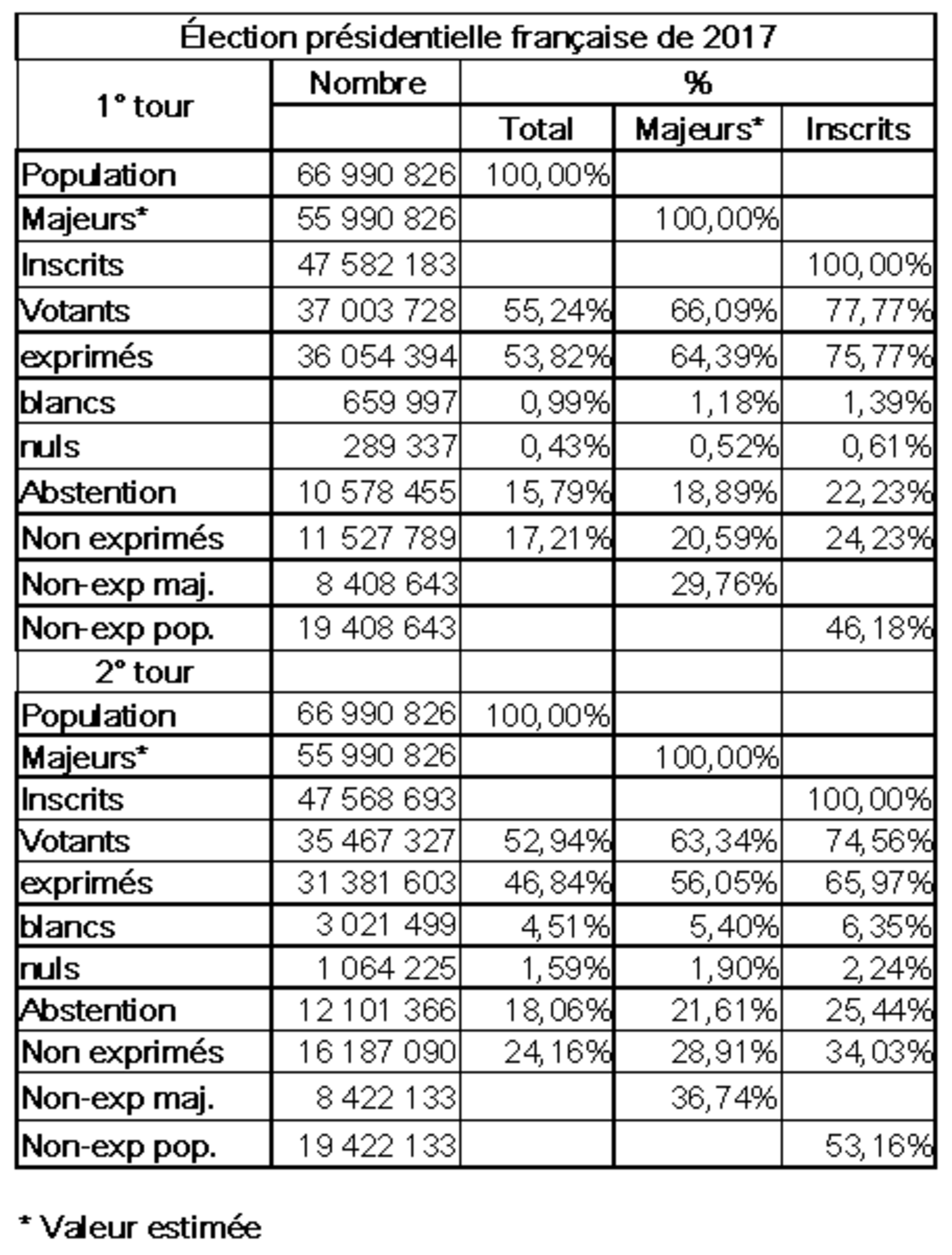 Comme on le voit dans ce tableau, dès lors qu'on prend en compte l'abstention les deux candidats arrivés en tête au premier tour obtiennent moins de voix qu'il n'y a d'abstentionnistes (respectivement, 16%, 18% et 22%), et au second tour, le candidat élu recueille moins de 44% des suffrages des inscrits. Pour précision, dans ce tableau conçu pour une insertion dans le billet «Macron et la merde, apologue» figure aussi le rapport entre le total de voix et la population totale parce que dans la réalité observable les voix personnes “sans droit de vote” comptent, qu'elles s'expriment directement (manifestations et grèves) ou indirectement (manifestation de parents, de défenseurs des droits), les voix des mineurs et des résidents étrangers, y compris ceux “illégaux”: quand un million de parents manifestent pour s'opposer à une loi sur l'éducation, quand cinq cent mille “sans papiers” manifestent et surtout, se mettent en grève, quand plus d'un million de collégiens, lycéens et étudiants se mobilisent contre une décision gouvernementale, que font les pouvoirs publics? Le plus souvent ils cèdent. C'est tout l'écart entre LA politique et LE politique: les médias s'intéressent avant tout à LA politique, c'est-à-dire à l'action de l'exécutif et du législatif et, de loin en loin, aux élections et aux référendums, et tendent à placer dans la catégorie “mouvements sociaux” LE politique, l'expression directe de sa volonté par une frange non négligeable de la population globale, qu'elle ait ou non la possibilité de s'exprimer dans les urnes. D'où, Macron n'a pas recueilli l'assentiment de 66% des Français mais de seulement 66% des exprimés, 44% des inscrits et 31% de la population générale, et quand il a tenté de mettre en œuvre sa politique il s'aperçut assez vite que la majorité électorale n'induit pas la majorité réelle, de fait près de 70% des Français et résidents ne se sont pas prononcés pour lui, et plus de la moitié de la population contre lui. Si on y a joute le fait qu'une part somme toute importante des personnes qui lui ont donné leur voix a voté non pas pour lui mais contre Marine Le Pen, la notion de “majorité électorale” apparaît plus que douteuse...