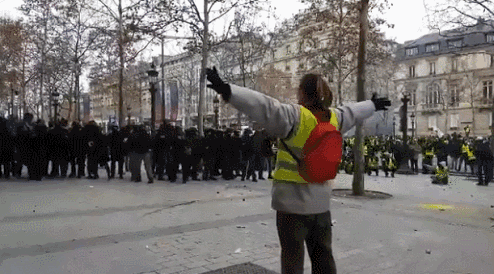 Un autre usage linguistique prédominant ces derniers jours est le recours au terme “casseurs”. Sa première occurrence est ancienne, nous explique l’historienne Ludivine Bantigny. Et on continue d’en faire, aujourd’hui, une utilisation fallacieuse, visant à scinder les participants au mouvement en deux groupes : ceux qui se désolidarisent des violences, et ceux qui ne les condamnent pas directement. Mais face à cette bipartition construite et instrumentalisée nous revient en mémoire le moment très particulier, lors du mouvement de lutte contre la Loi Travail, où a émergé le slogan “Nous sommes tous des casseurs”. La frontière entre “pacifistes” et “casseurs” est devenue de plus en plus poreuse, dans la mesure où la violence n’est plus aussi marginalisée qu’auparavant, notamment du fait de la colère croissante des manifestants de tous bords. Il n’est pas question, pour les pouvoirs publics, d’alerter sur une quelconque répression systématique des gilets jaunes lors de leurs rassemblements, mais bien d’appeler les gilets jaunes raisonnables à se méfier des gilets jaunes violents eux-mêmes, puisqu’ils constitueraient une menace pour leur sécurité. La réalité est plus nuancée. Des groupes d’hommes viennent en effet casser et piller, mais ils représentent une frange non-représentative du mouvement, bien que les motivations qui sont les leurs doivent être interrogées. Leur influence sur le mouvement demeure très limitée, mais l’écho donné à leurs actions est très grand dans les médias. Les gilets jaunes représentent une mobilisation autrement plus large et complexe, que l’on ne peut se contenter d’aborder à travers ce prisme, même si, dans le cadre de la diversité des tactiques, certains gilets jaunes emploient la violence à des fins revendicatives.
