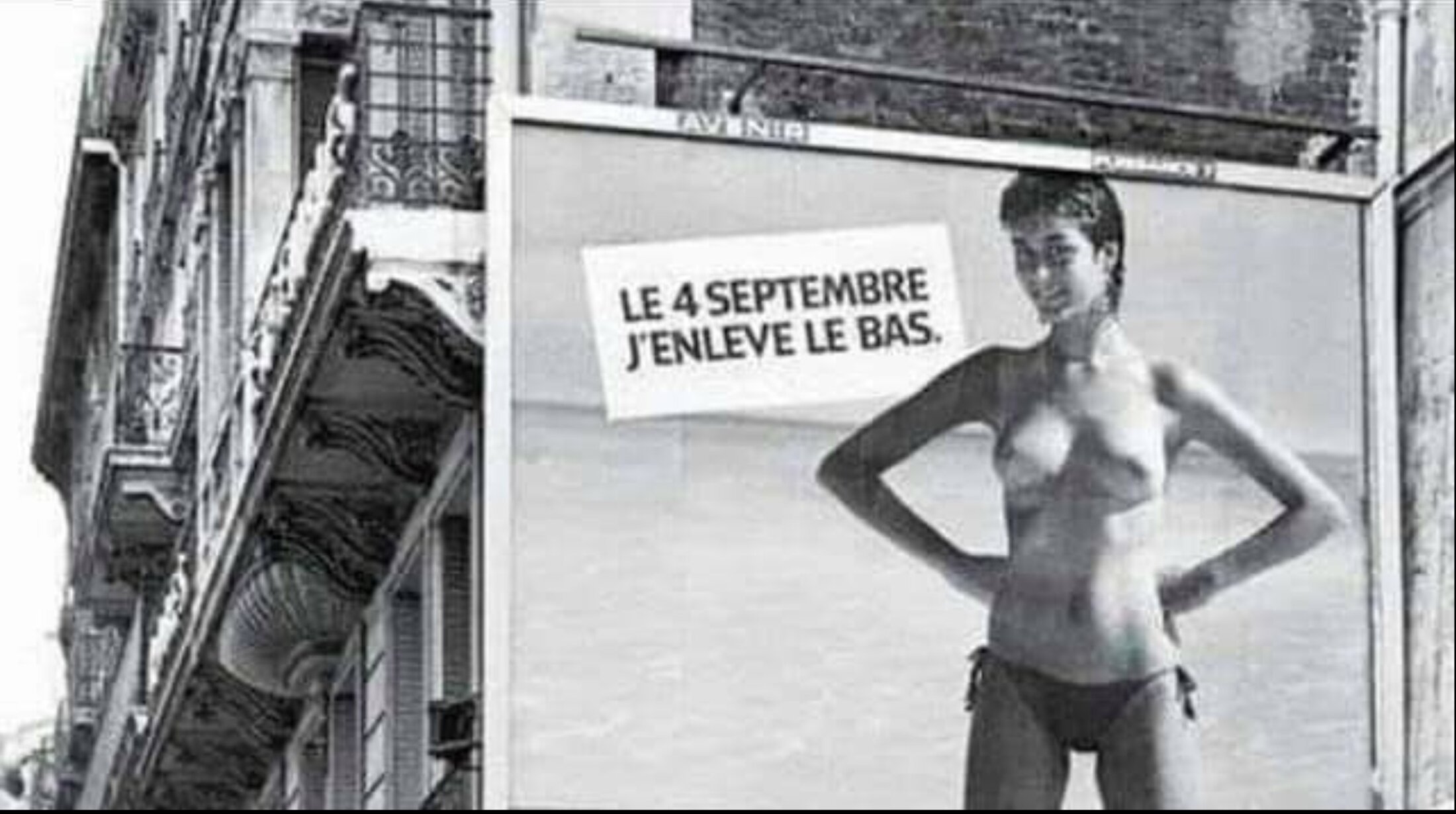 C'était en 1981. Depuis quelques jours on voit repasser cette photo supposée illustrer une opposition au discours de Blanquer sur la "tenue républicaine" des lycéennes. Il semble que le summum de la liberté féministe soit aujourd'hui la possibilité pour une femme d'afficher un décolleté ultra plongeant et une jupe si courte qu'on ait le plaisir de voir ses fesses sans qu'un homme n'ait le droit de regarder ni de bouger une oreille au risque de passer pour un obsédé sexuel. J'avais cru comprendre qu'il y a peu de temps encore les féministes dénonçaient ce genre d'affiche comme étant une exploitation du corps de la femme. Ce fut le cas en 1981 pour celle-ci et pour beaucoup d'autres campagnes de publicité jusqu'à aujourd'hui. Si je résume la pensée féministe, sur une affiche c'est mal, dans la rue c'est bien mais faut pas regarder si on a des pensées libidineuses. Je n'ai pas vraiment d'avis sur la question, mais ça me rappelle furieusement les préceptes religieux d'un autre âge où il va de soi que le sexe c'est mal et que toute pensée qui s'y rapporte fait de nous des pécheurs. Pour éviter toute ambiguïté, je précise que je suis opposé à toute forme de violence et de contrainte vestimentaire ou autre envers les femmes comme envers les hommes. Je suis également opposé à toute forme de censure morale et de négation de la sexualité et personne ne m'empêchera de penser, selon la tenue qu'elle porte, qu'une femme est bandante.