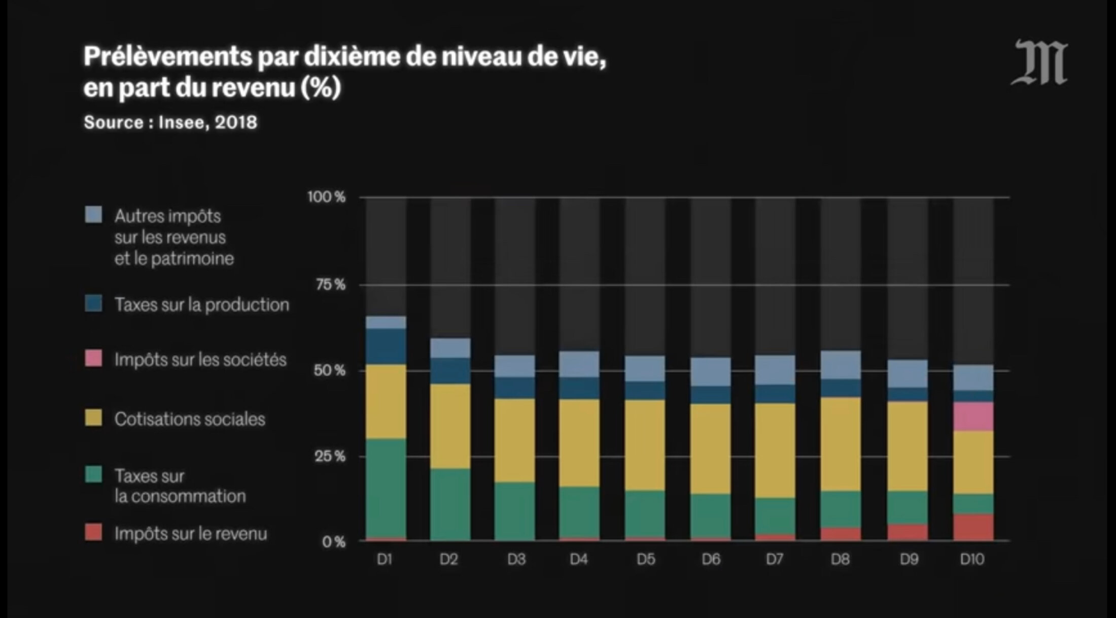 Ici de gauche à droite les différentes tranches de la population française, de la plus pauvre à la plus riche. On observe que les impôts prennent proportionnellement plus de place dans le budget de la classe moyenne et des plus pauvres. - Le Monde. Présidentielle 2022 : qui paie le plus d’impôts ? Les riches ou les pauvres ? https://youtu.be/FTqUpolCvpk